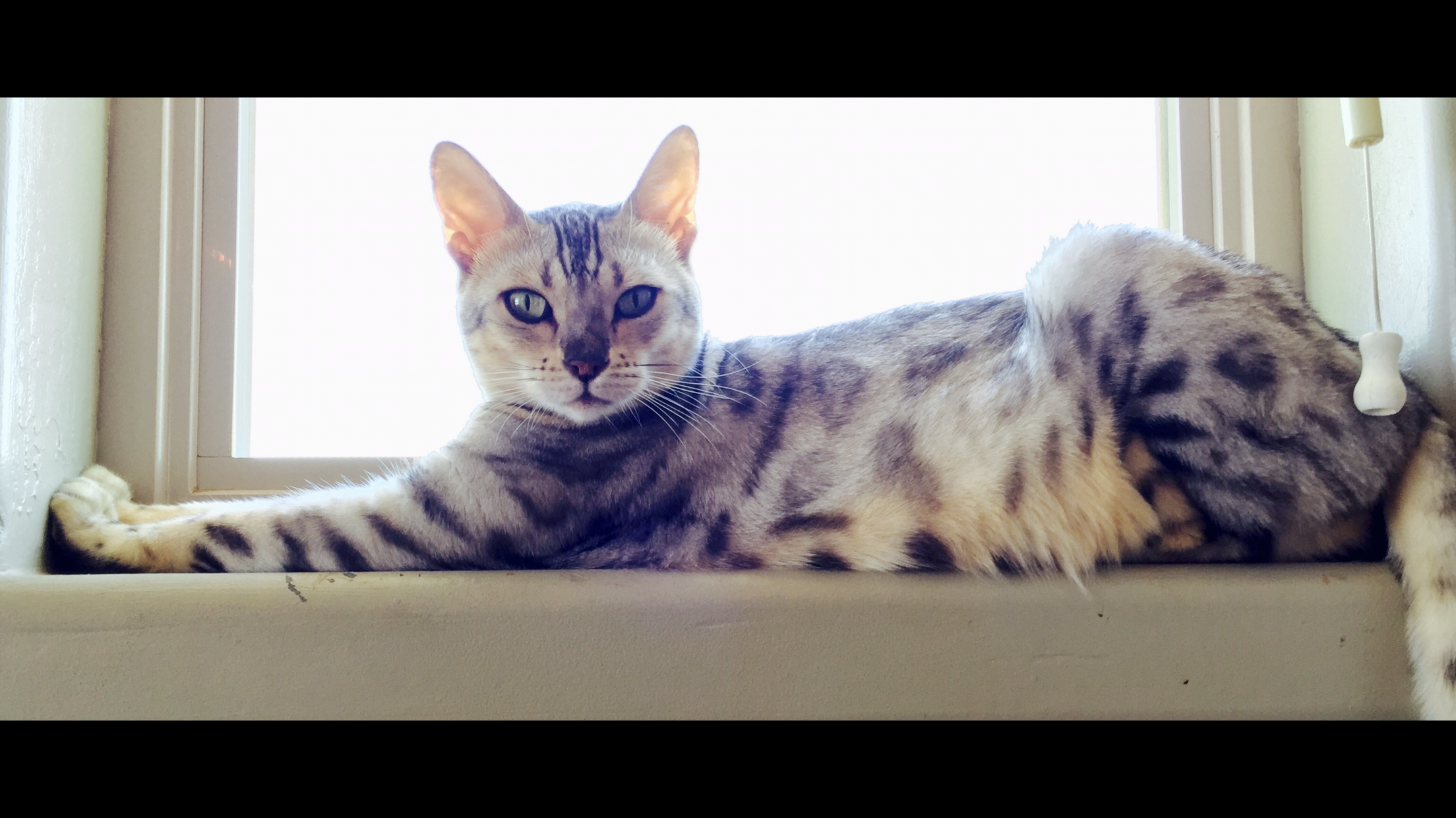 Watercolor painting of a black cat with green eyes, wearing a collar, lying down.