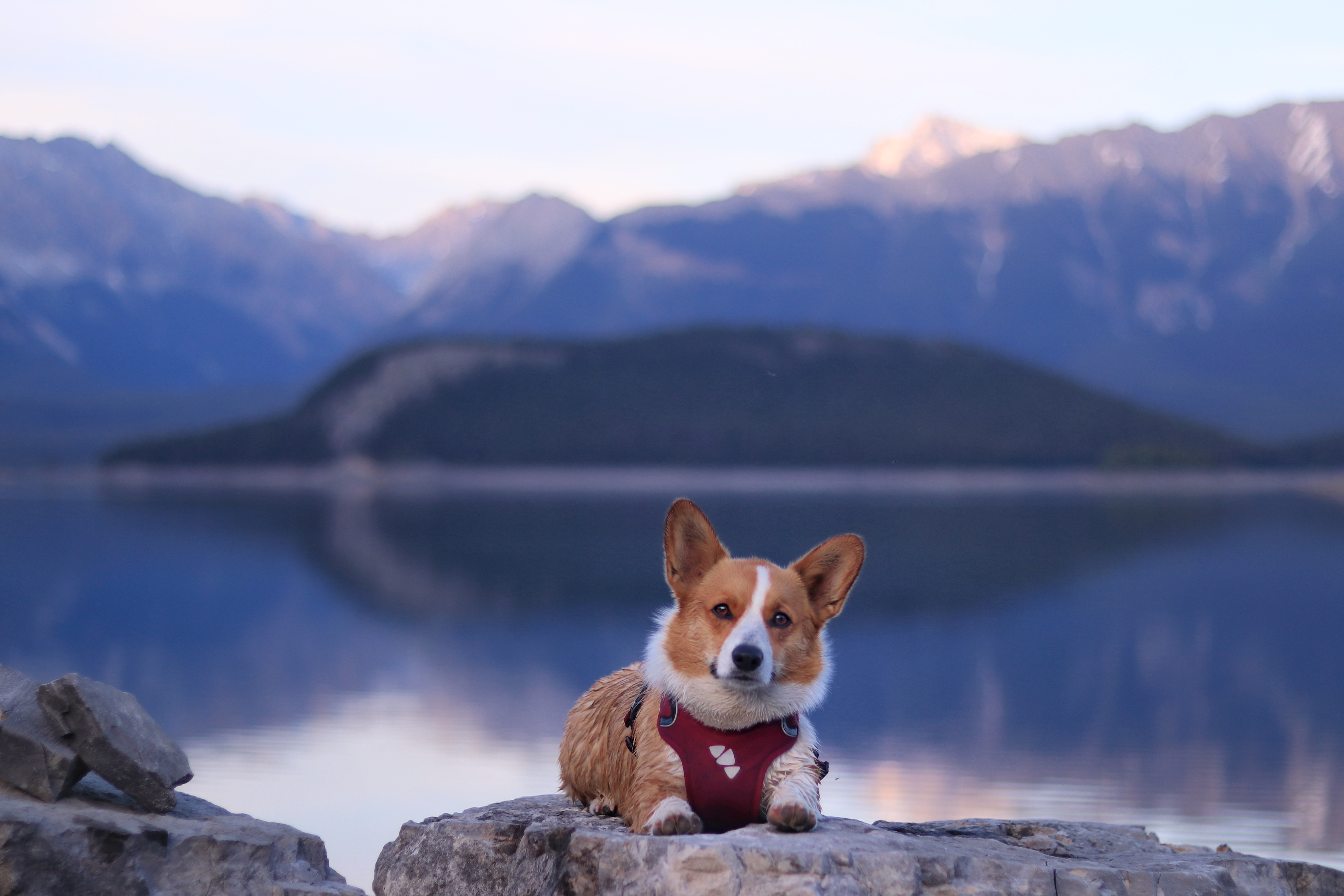 Corgi sitting on rocks overlooking a lake and mountains at sunset.