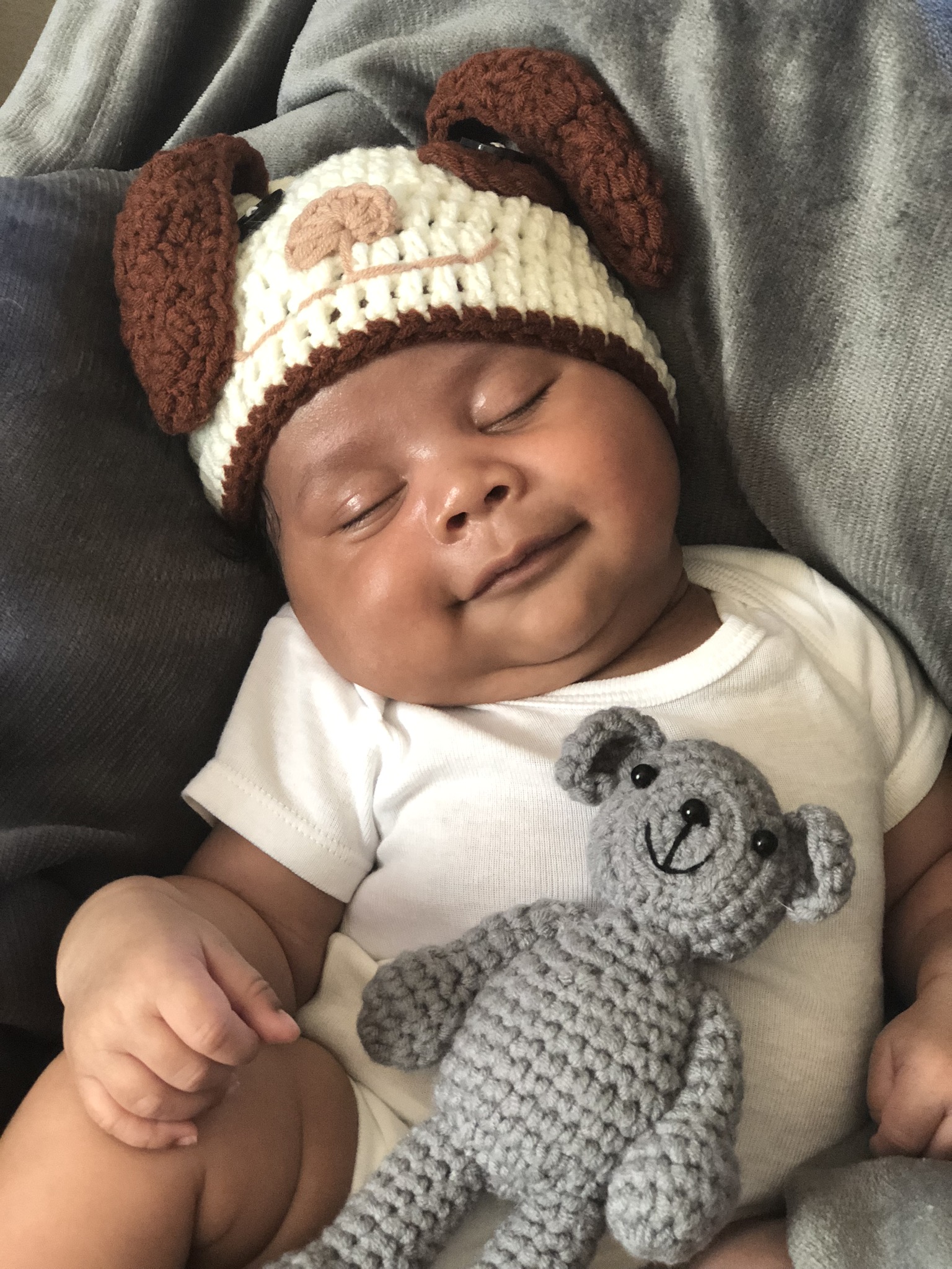 Sleeping baby wearing a knit hat and holding a stuffed animal.