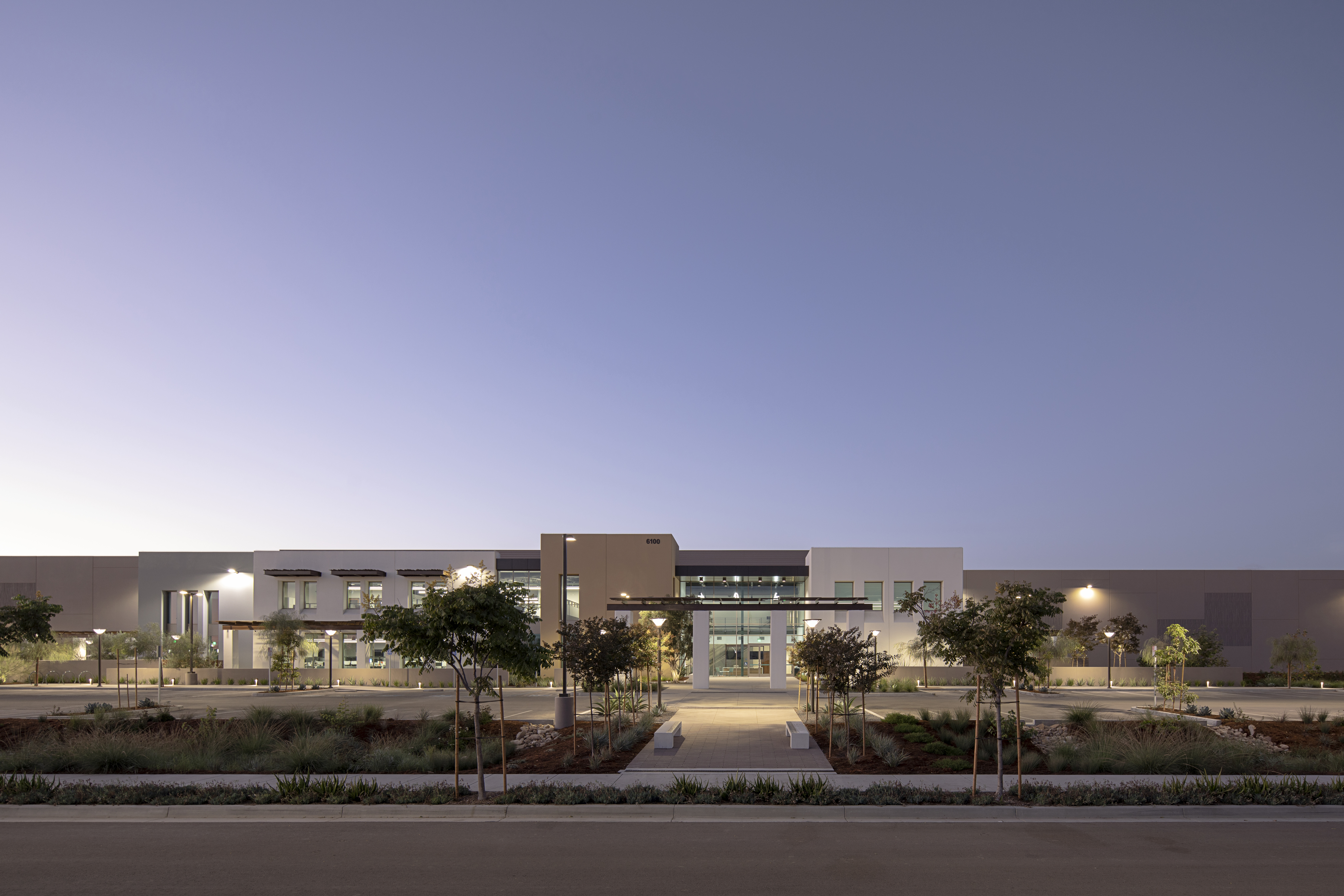 Watercolor painting of a modern building complex with parking lot and landscaping.