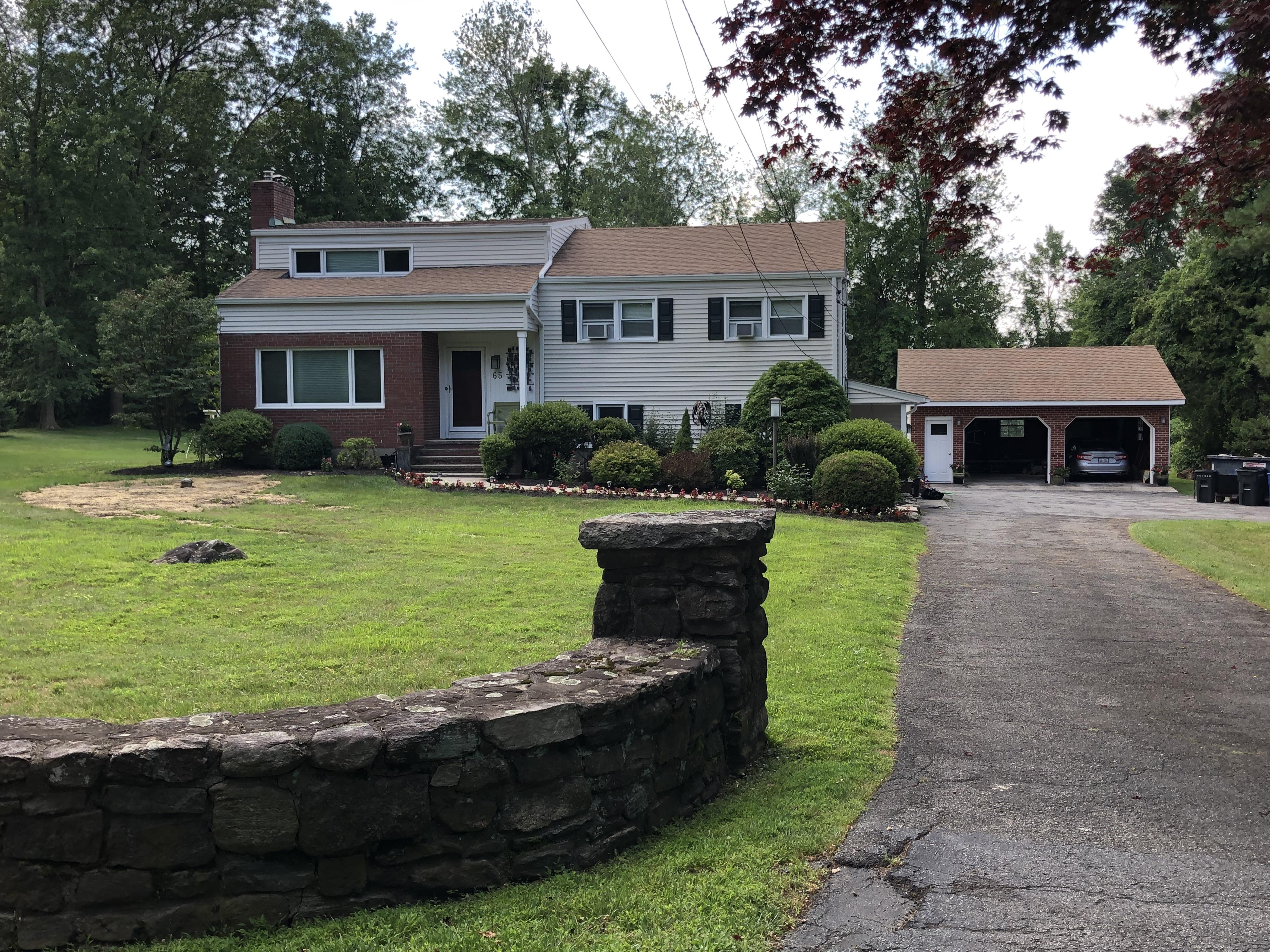Watercolor painting of a suburban house with a stone wall and driveway.