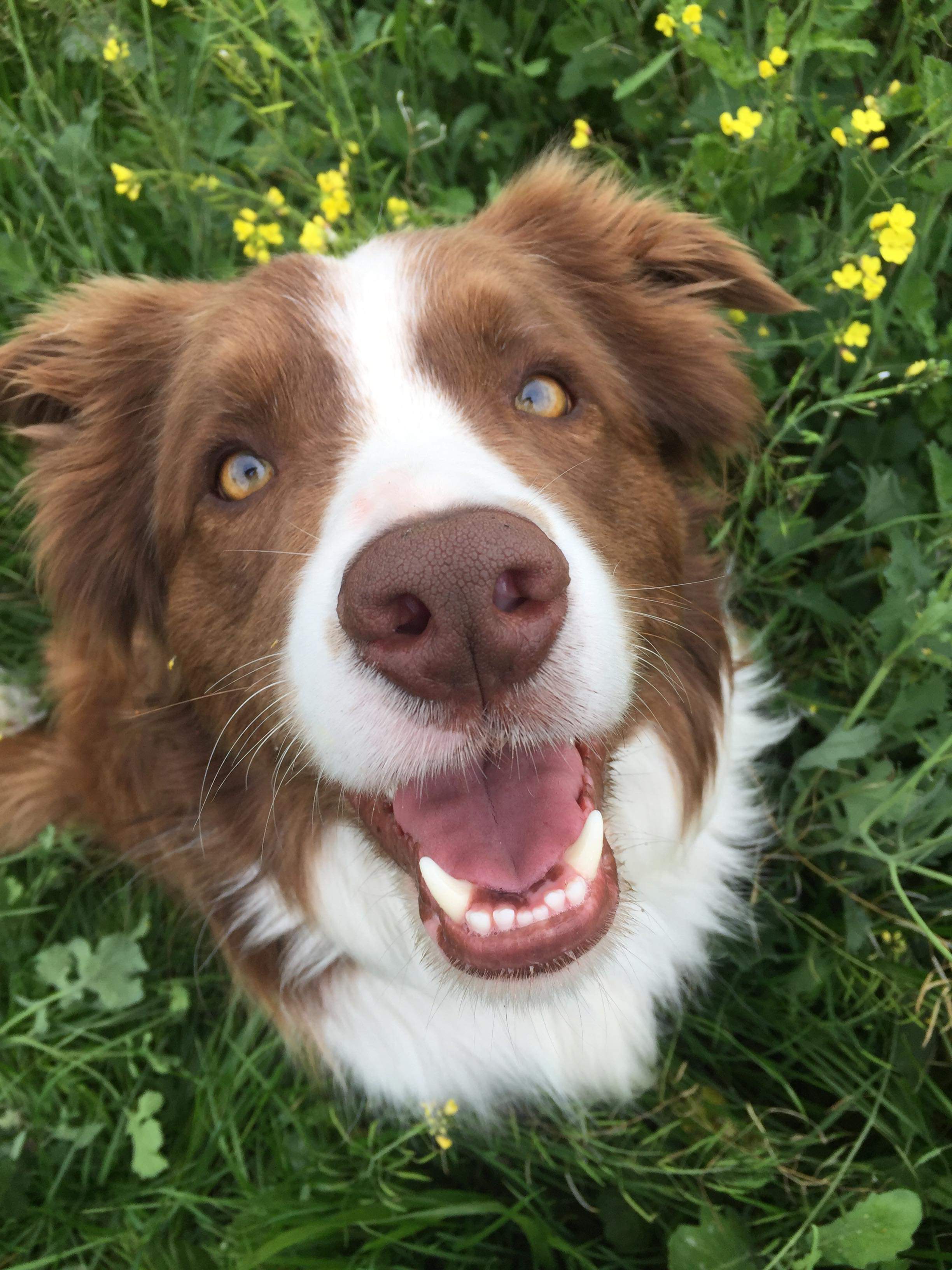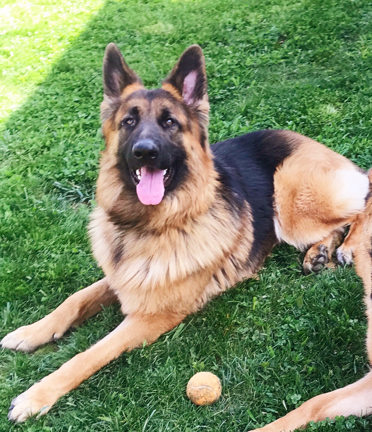Painting of a German Shepherd lying in the grass with a tennis ball.