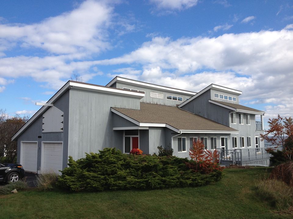 Watercolor painting of a gray house with a two-car garage, landscaping, and blue sky.