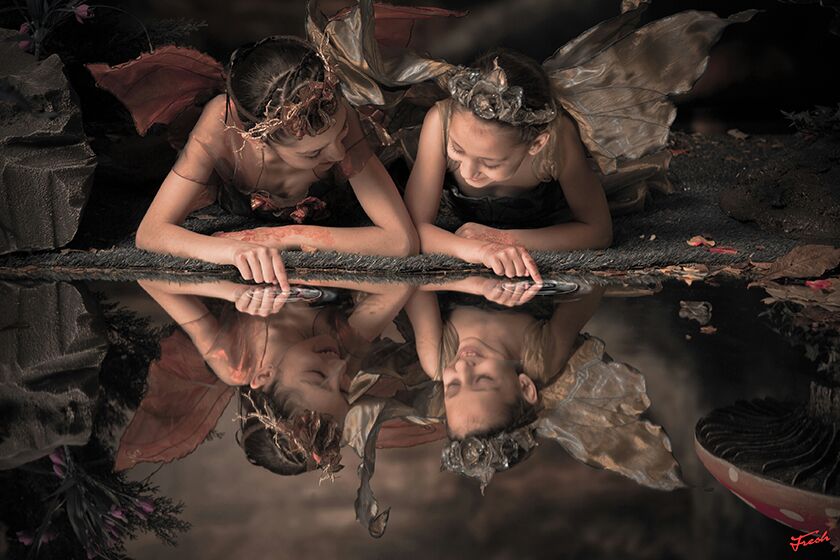 Painting of two girls in fairy costumes looking into a reflective surface showing their reflections.