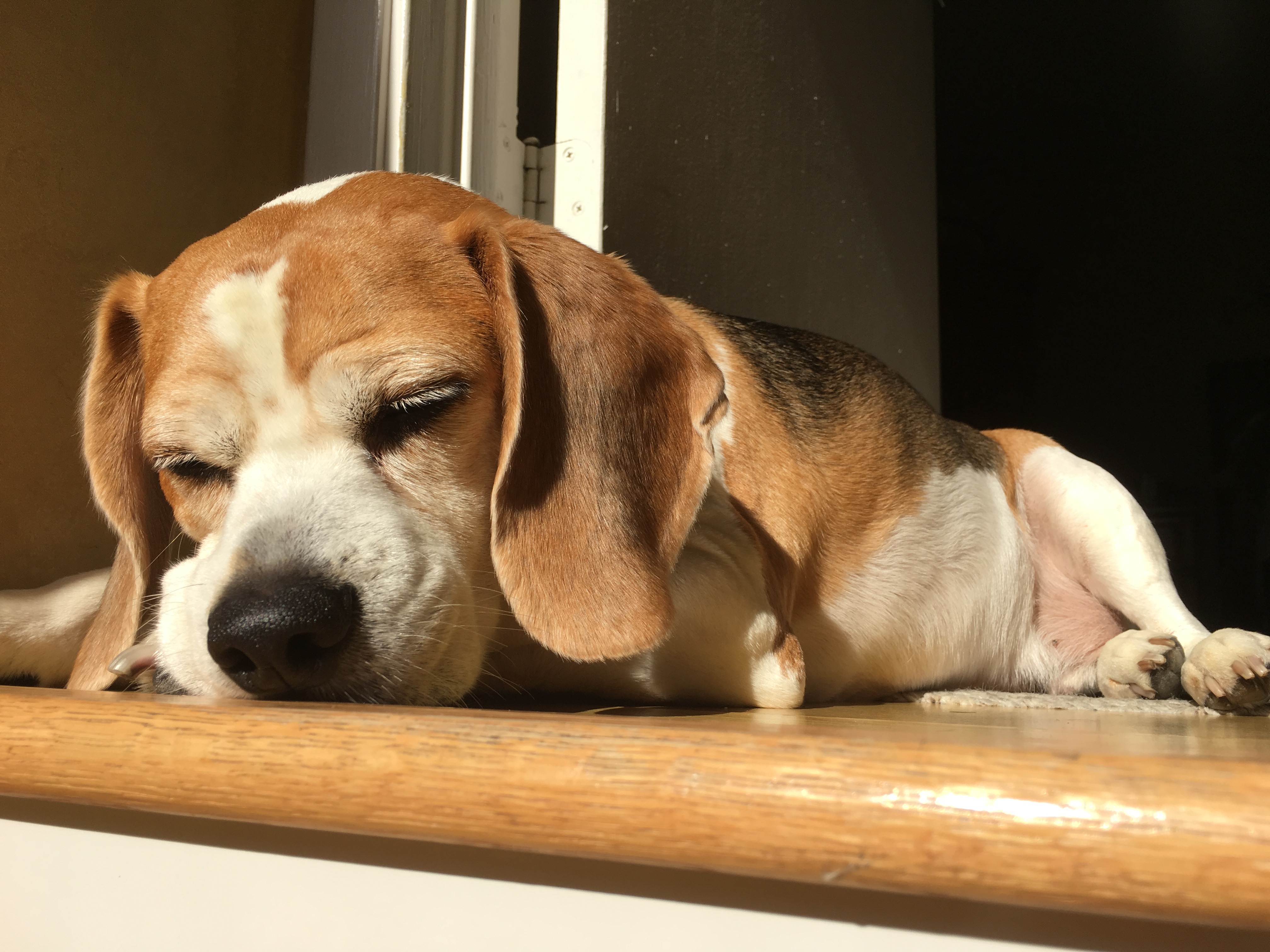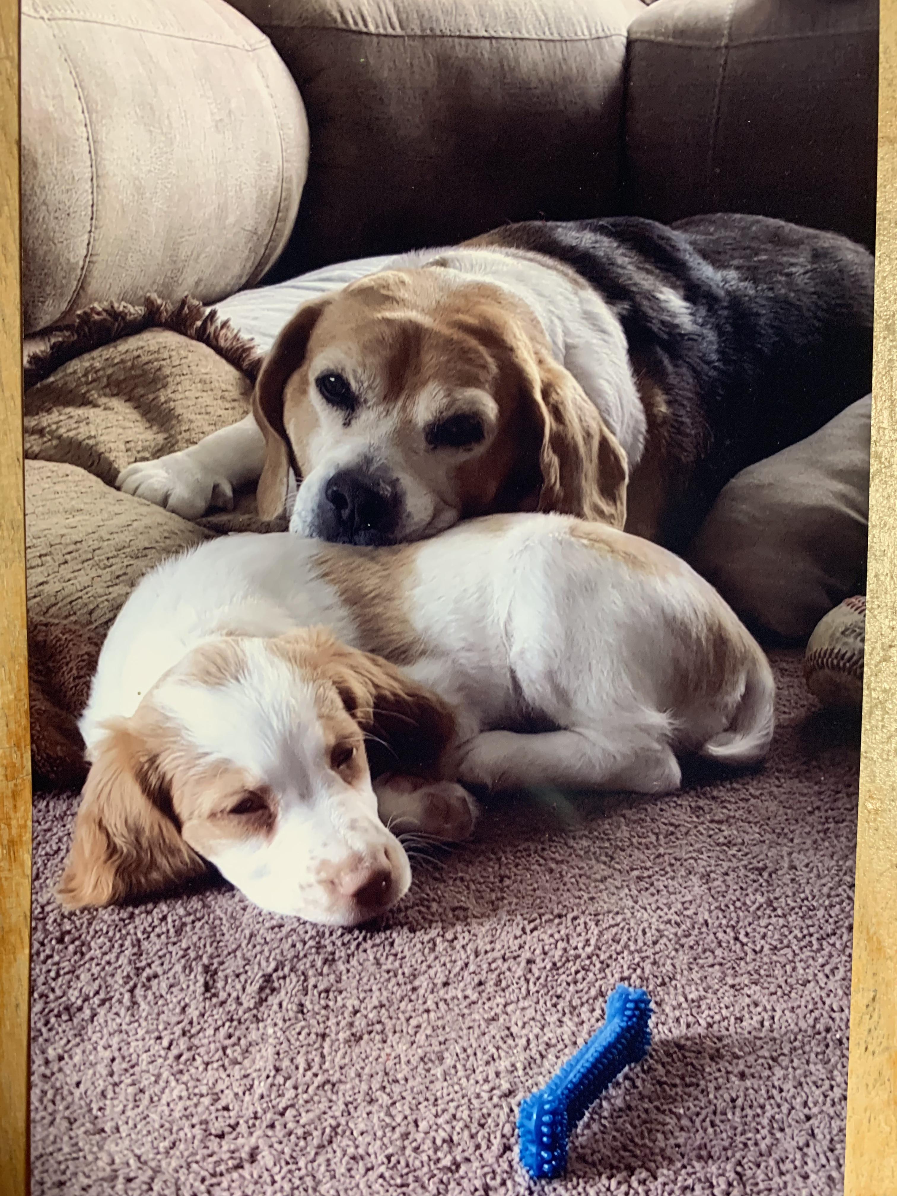 Painting of a beagle and a spaniel puppy sleeping together on a couch.