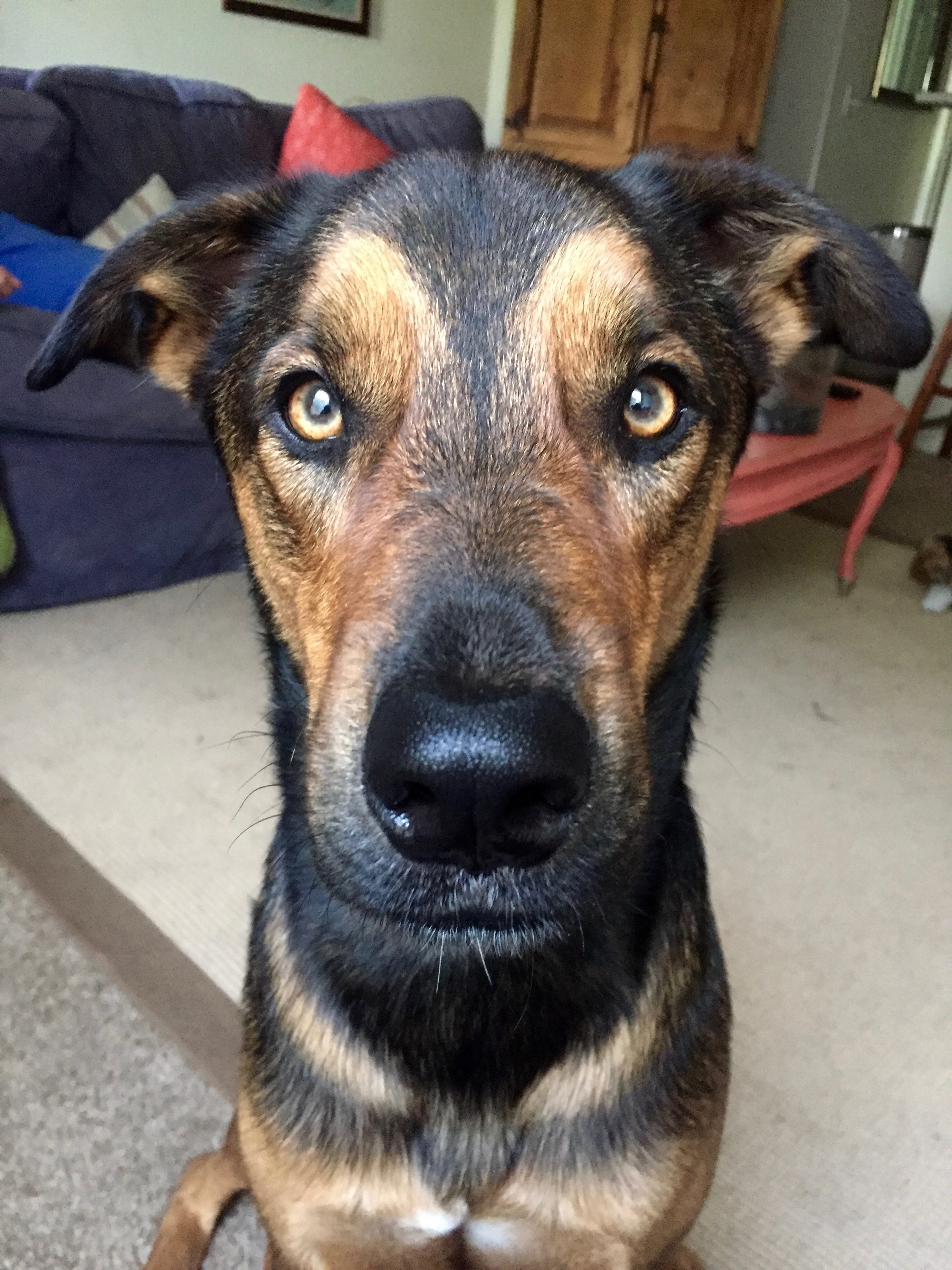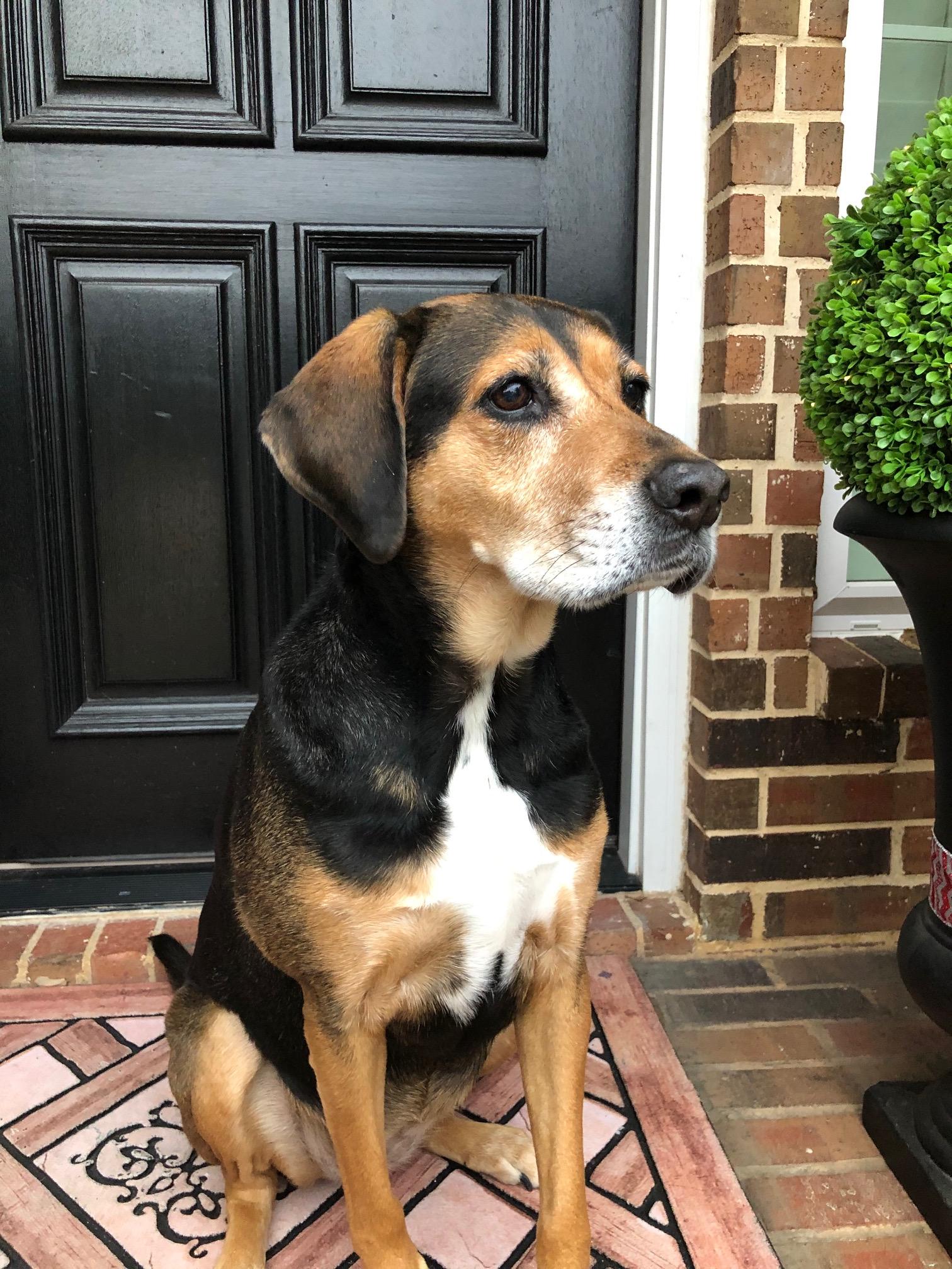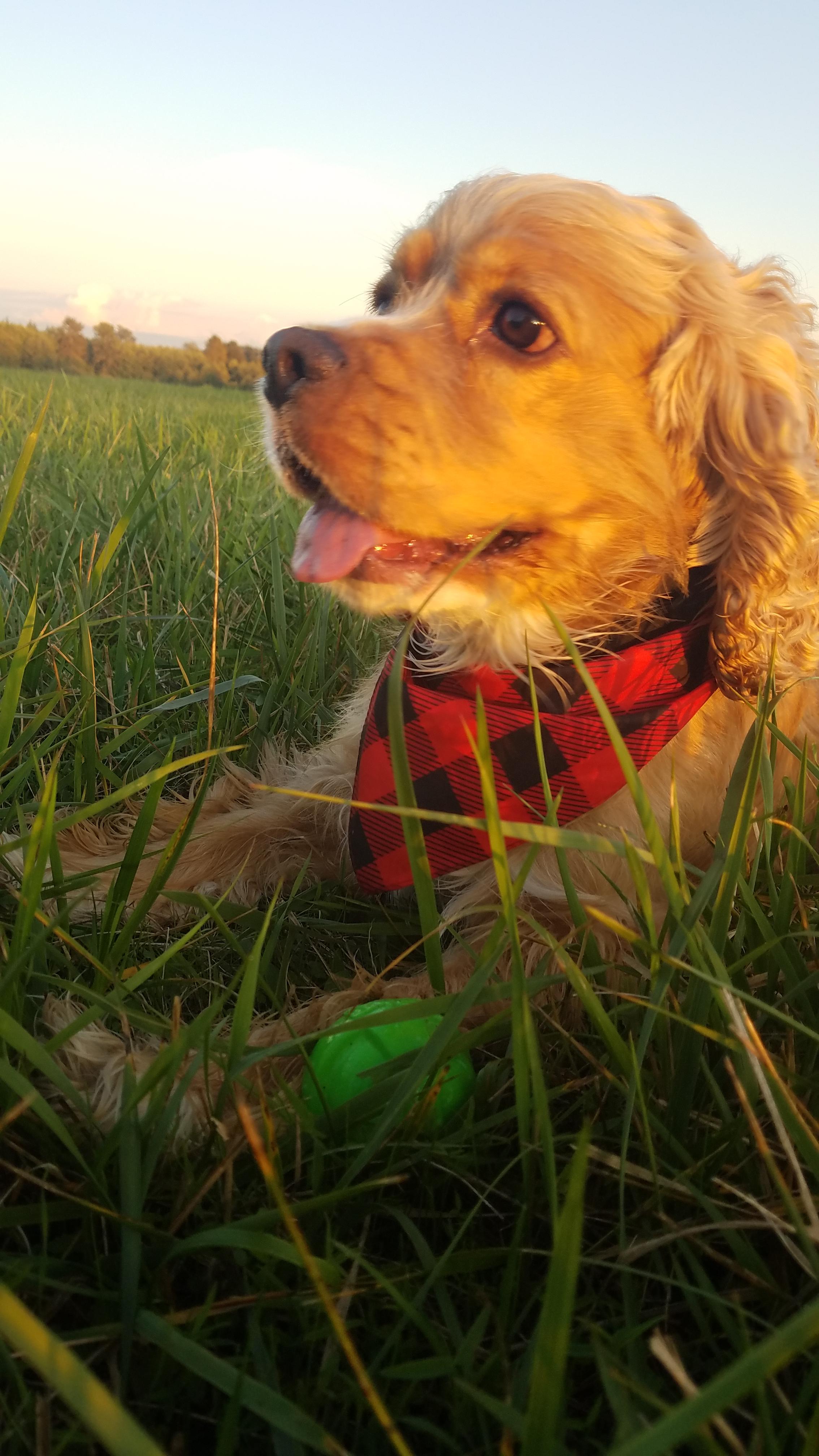 Painting of a golden cocker spaniel wearing a red and black bandana in the grass
