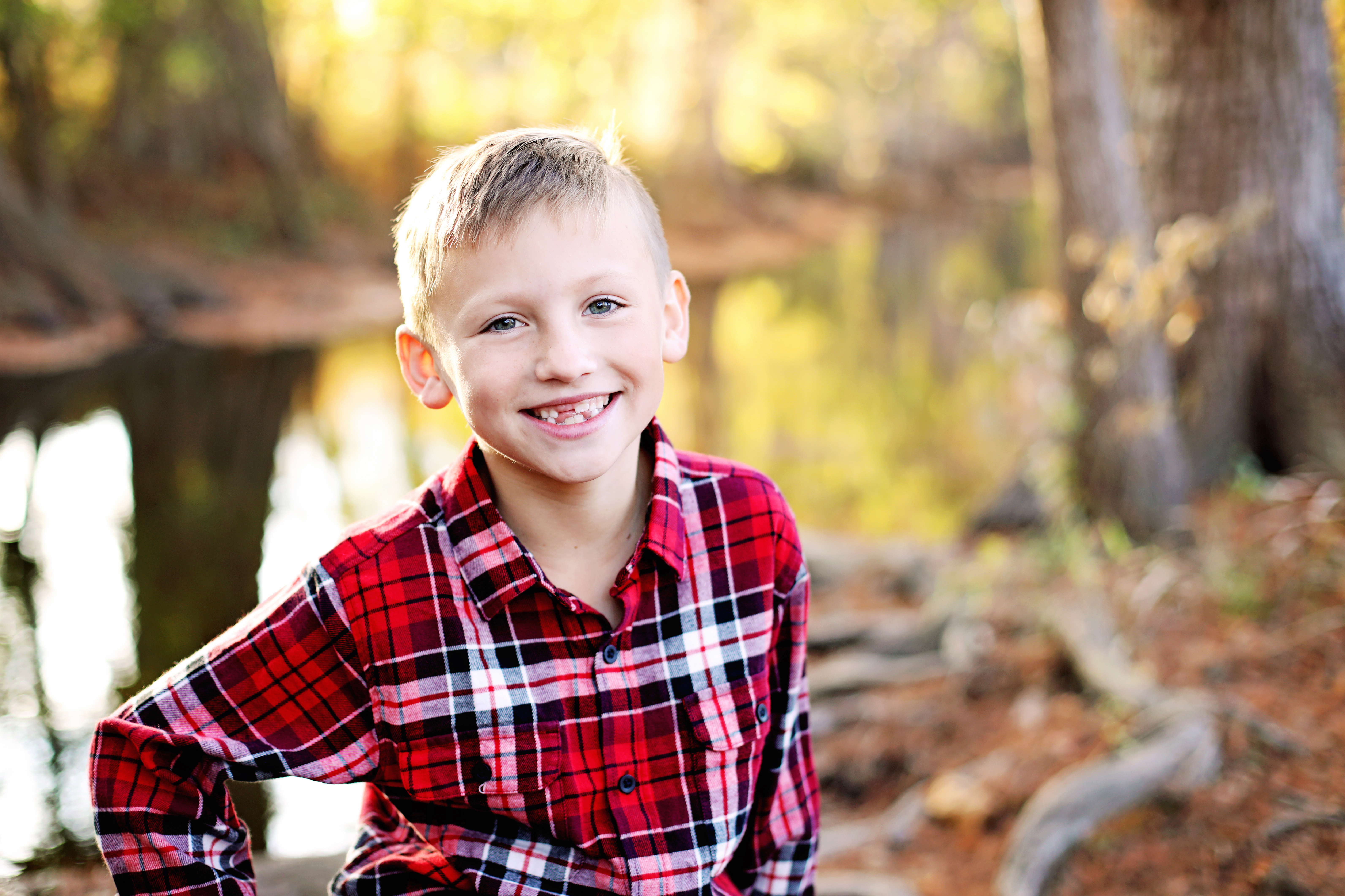 Black and white portrait of a smiling boy with missing teeth, wearing a plaid shirt.