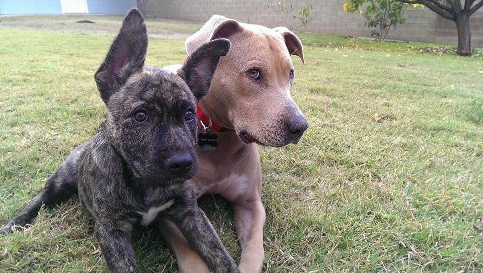 Painting of two puppies sitting in grass.