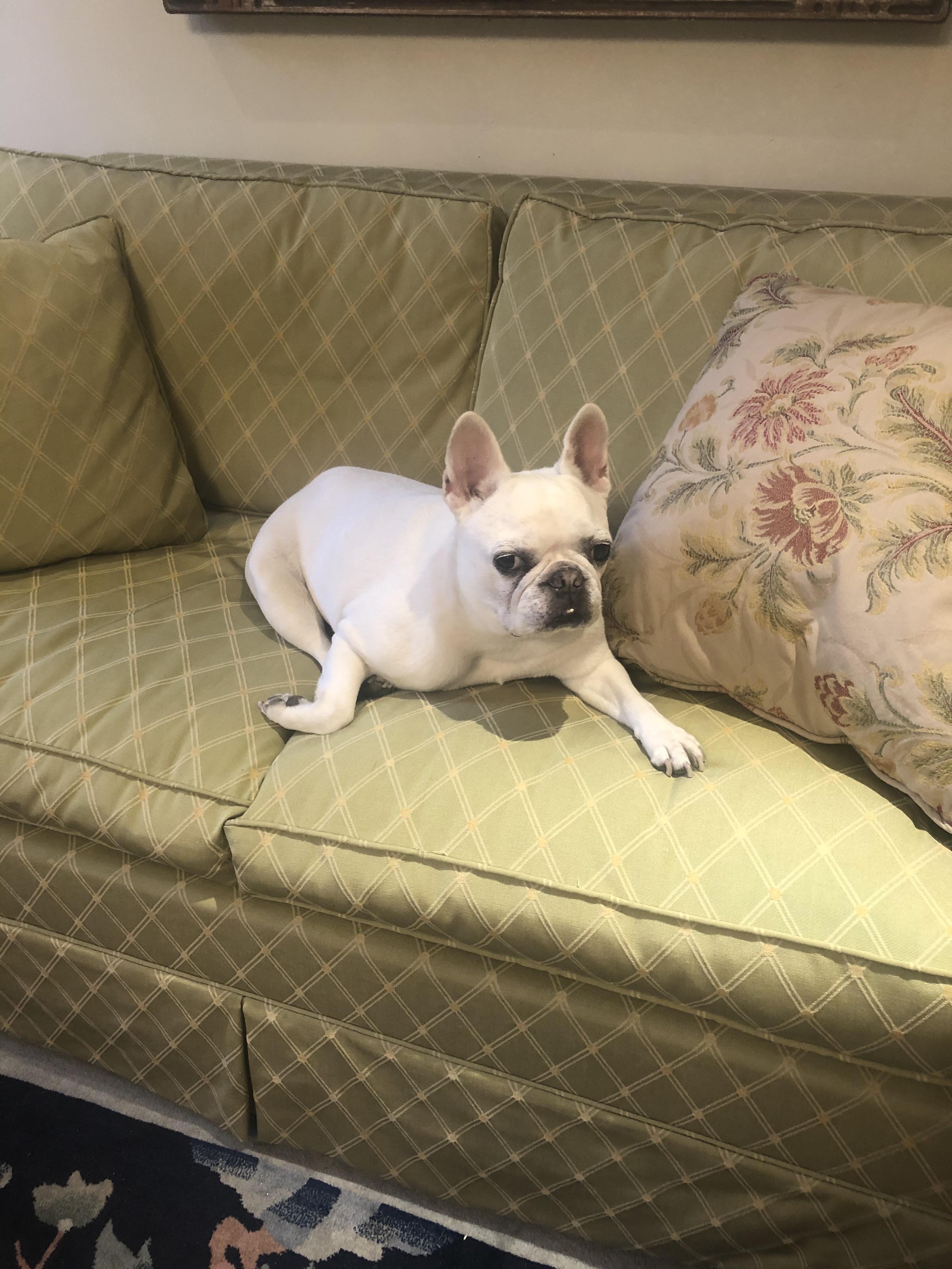 Painting of a white French bulldog lying on a couch.