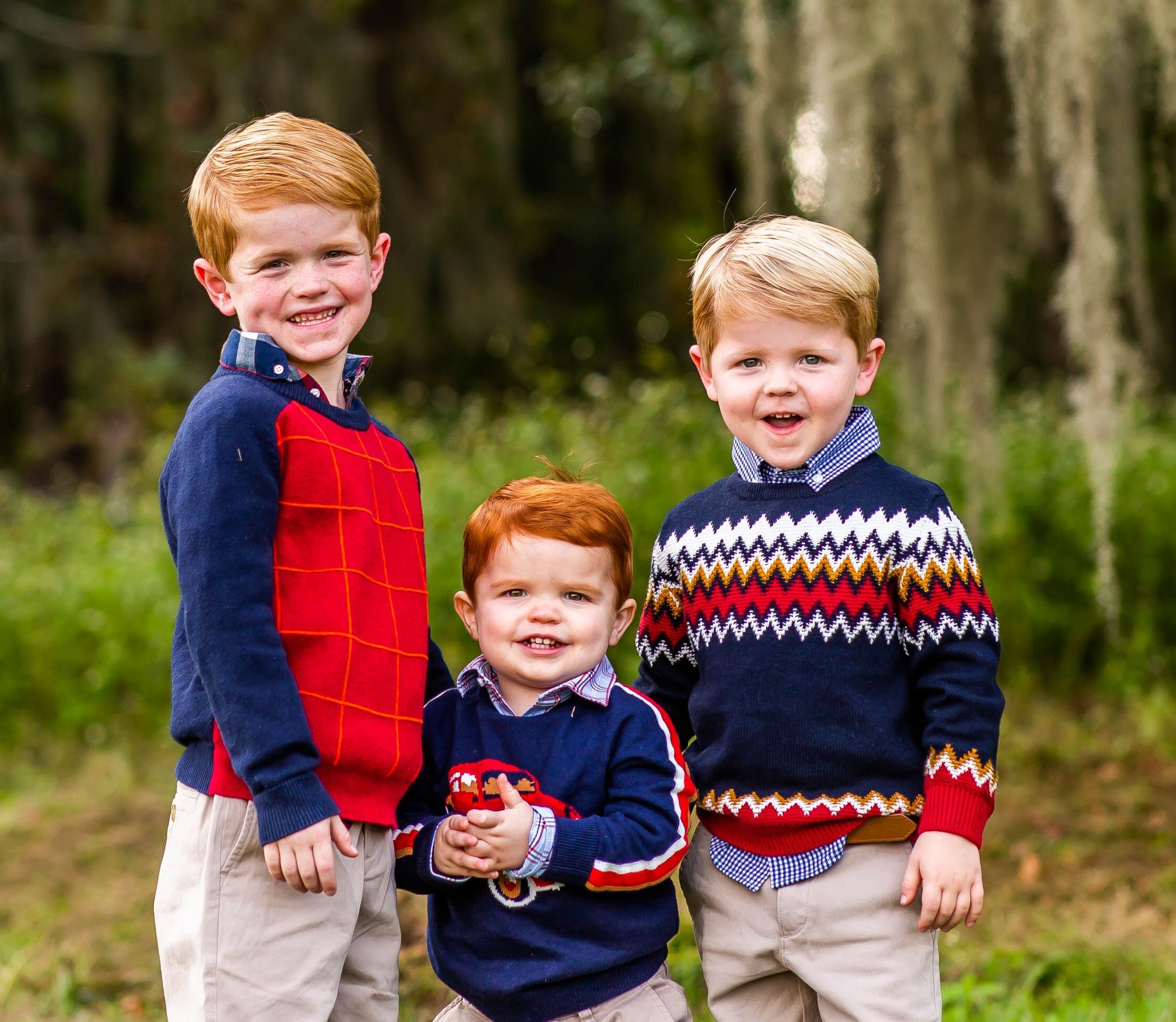 Portrait of three smiling red-haired boys in sweaters.