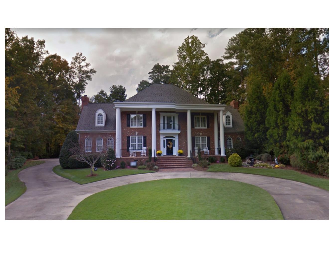 Watercolor painting of a large brick house with columns and a wraparound porch.