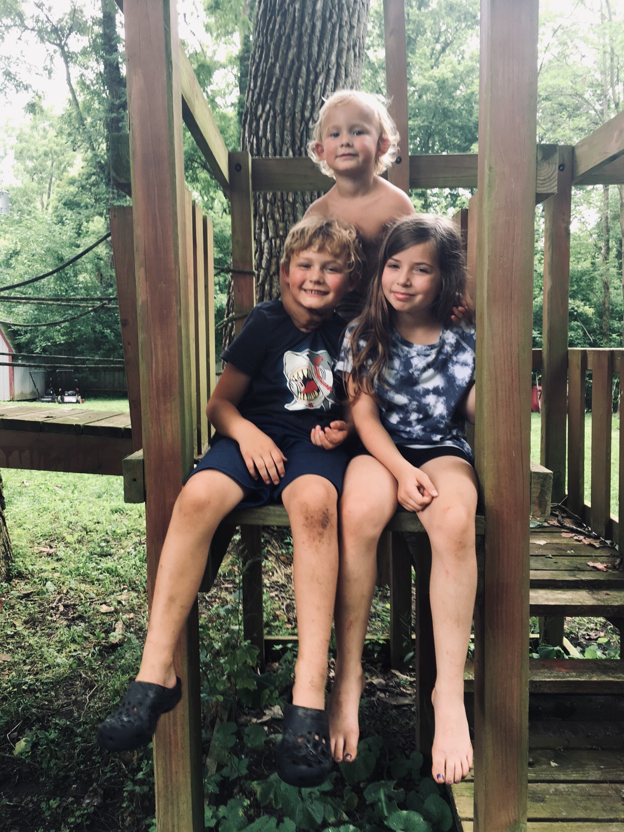 Three children sitting on a wooden play structure outdoors.