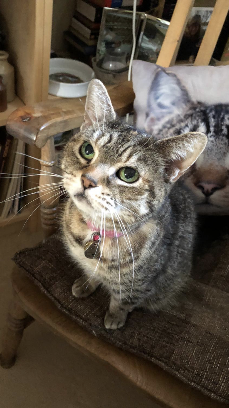Painting of a tabby cat wearing a pink collar with a bell, sitting on a chair and looking up.