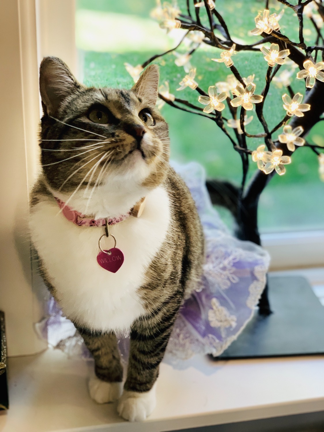 Painting of a tabby cat wearing a lavender dress and pink collar with a heart-shaped tag that says Willow