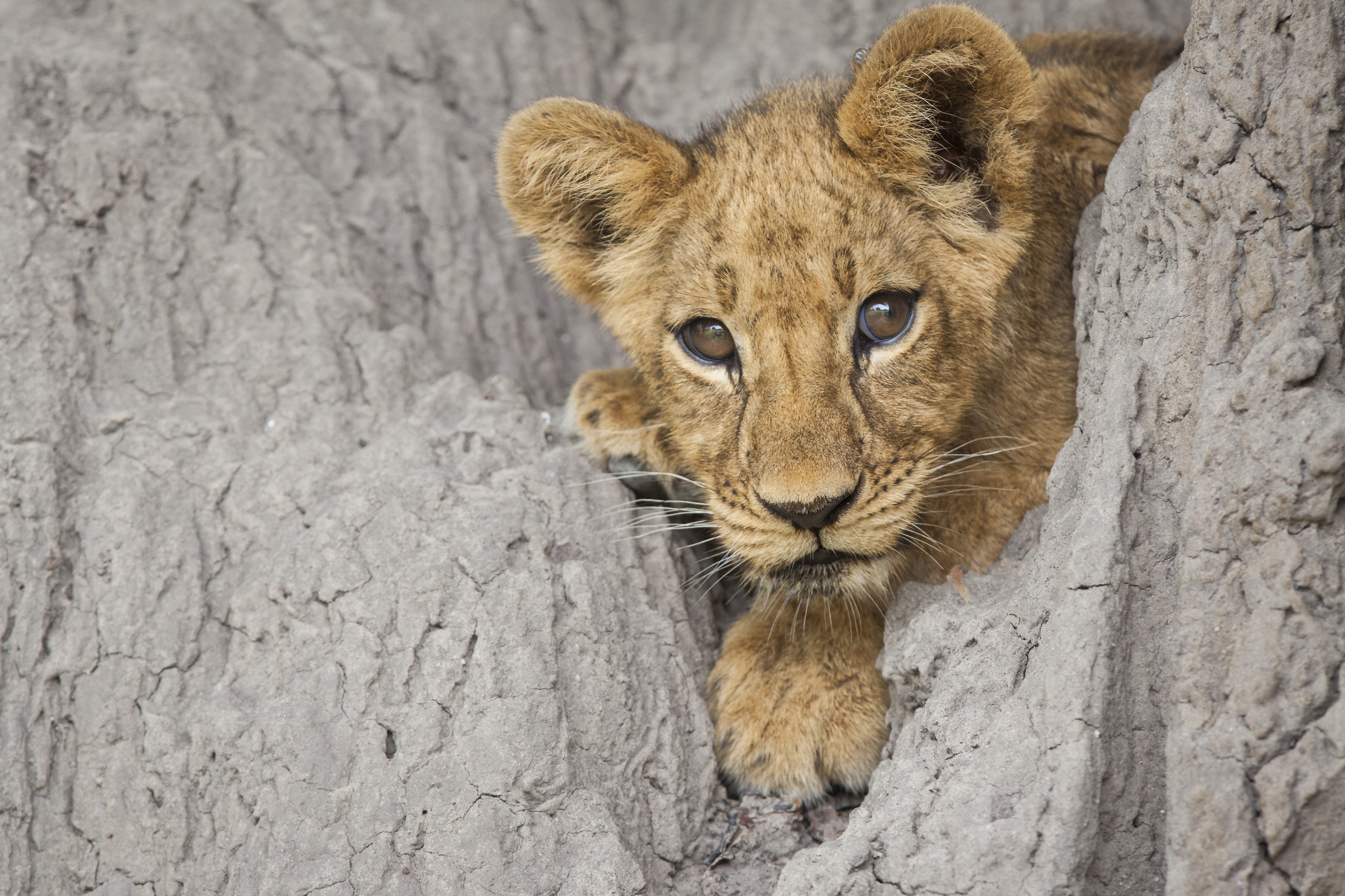 Lion cub peeking from rocks