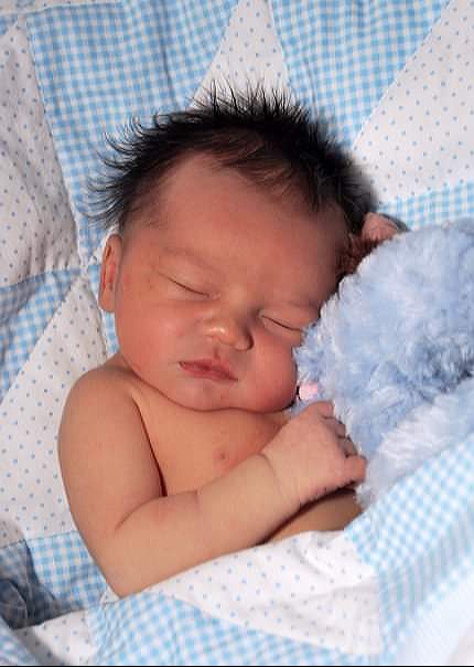 Sleeping baby holding a blue plush toy, painted portrait.