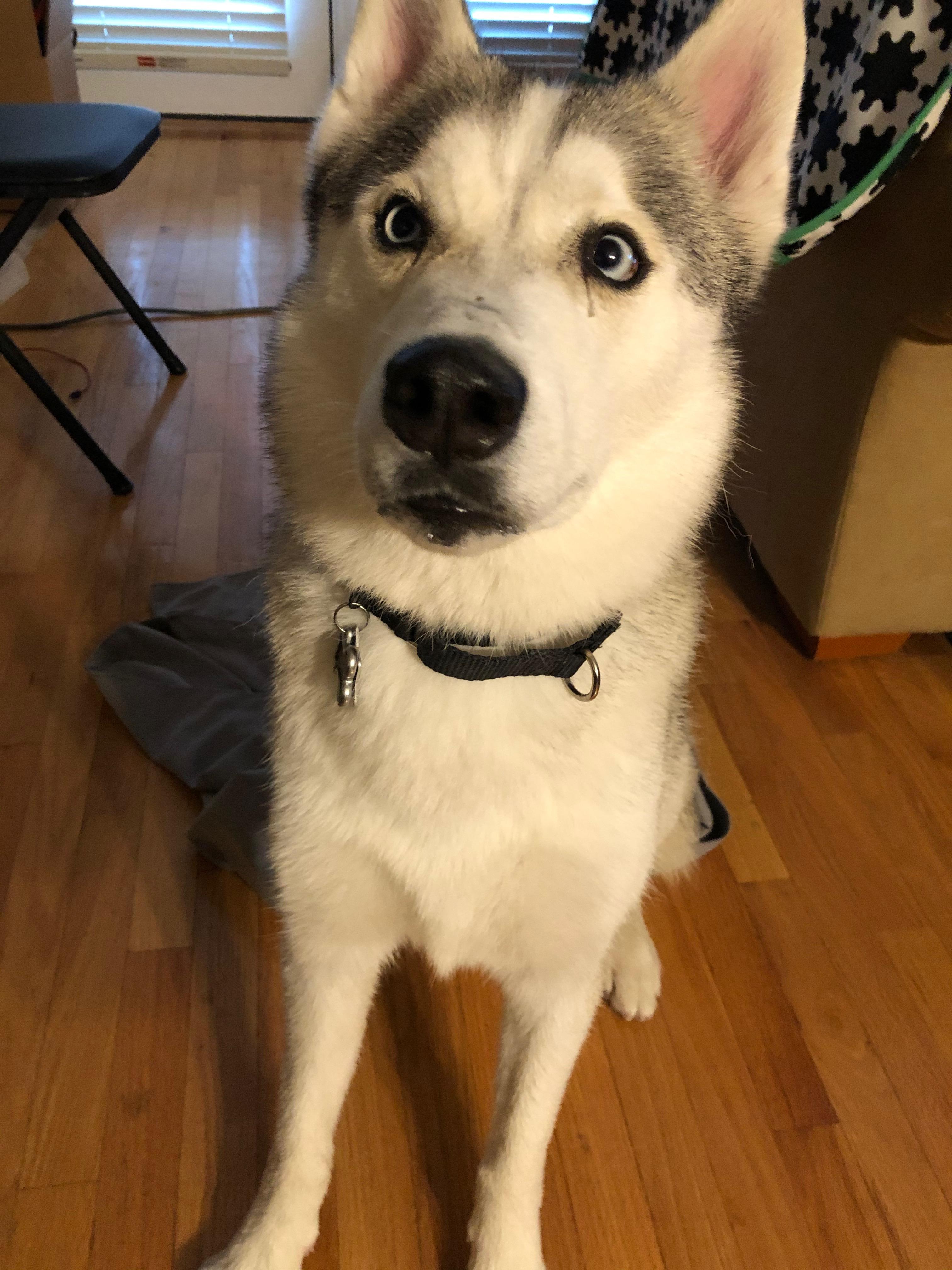 Painting of a husky dog offering its paw to a person.