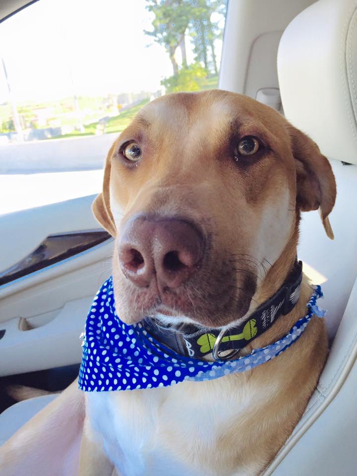Painting of a light brown dog wearing a blue bandana.