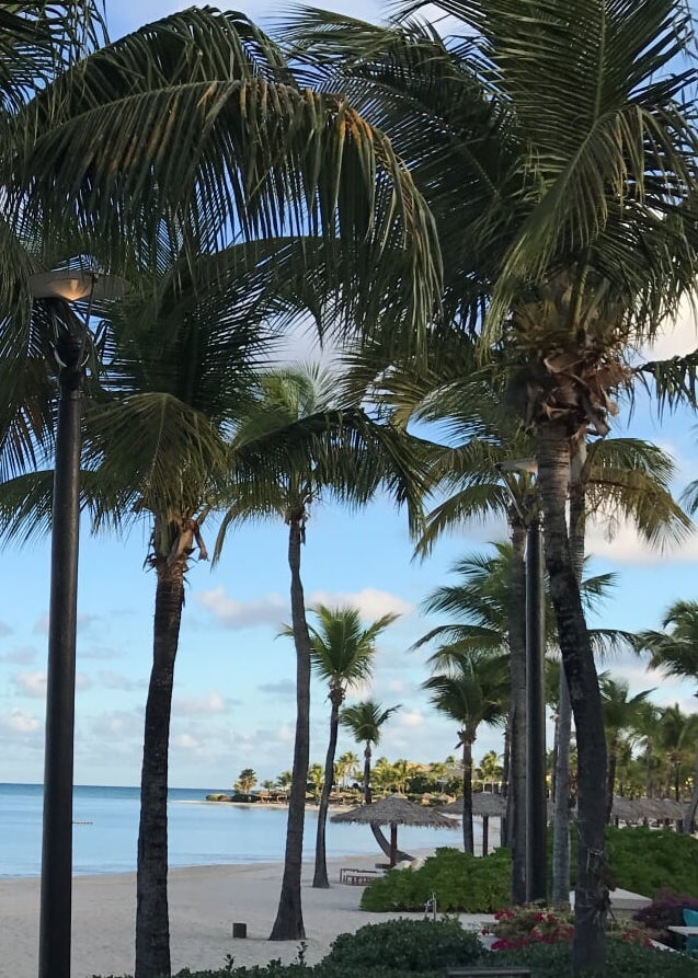 Painting of two smiling sisters wearing floral dresses and leis on a beach.