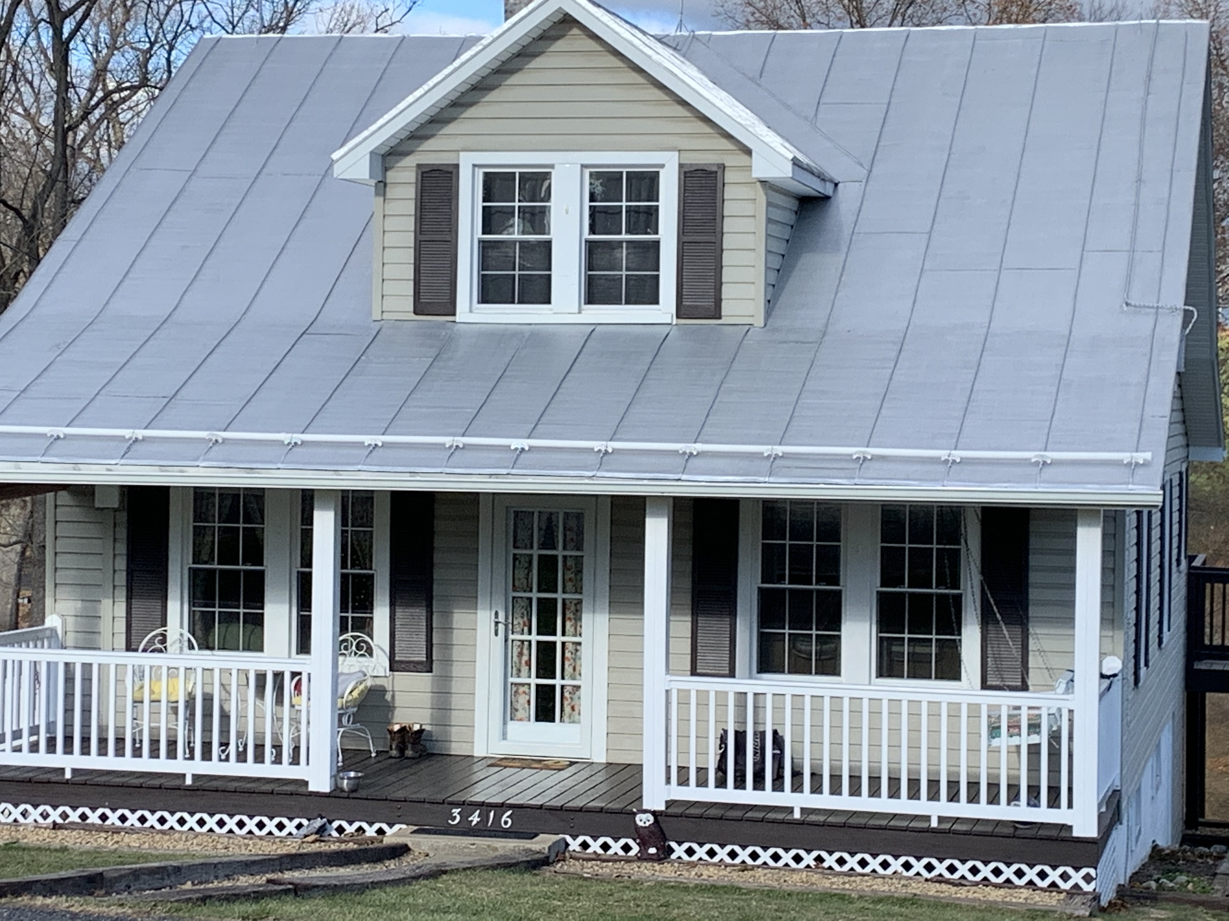 Painting of a light gray house with a metal roof and wraparound porch.