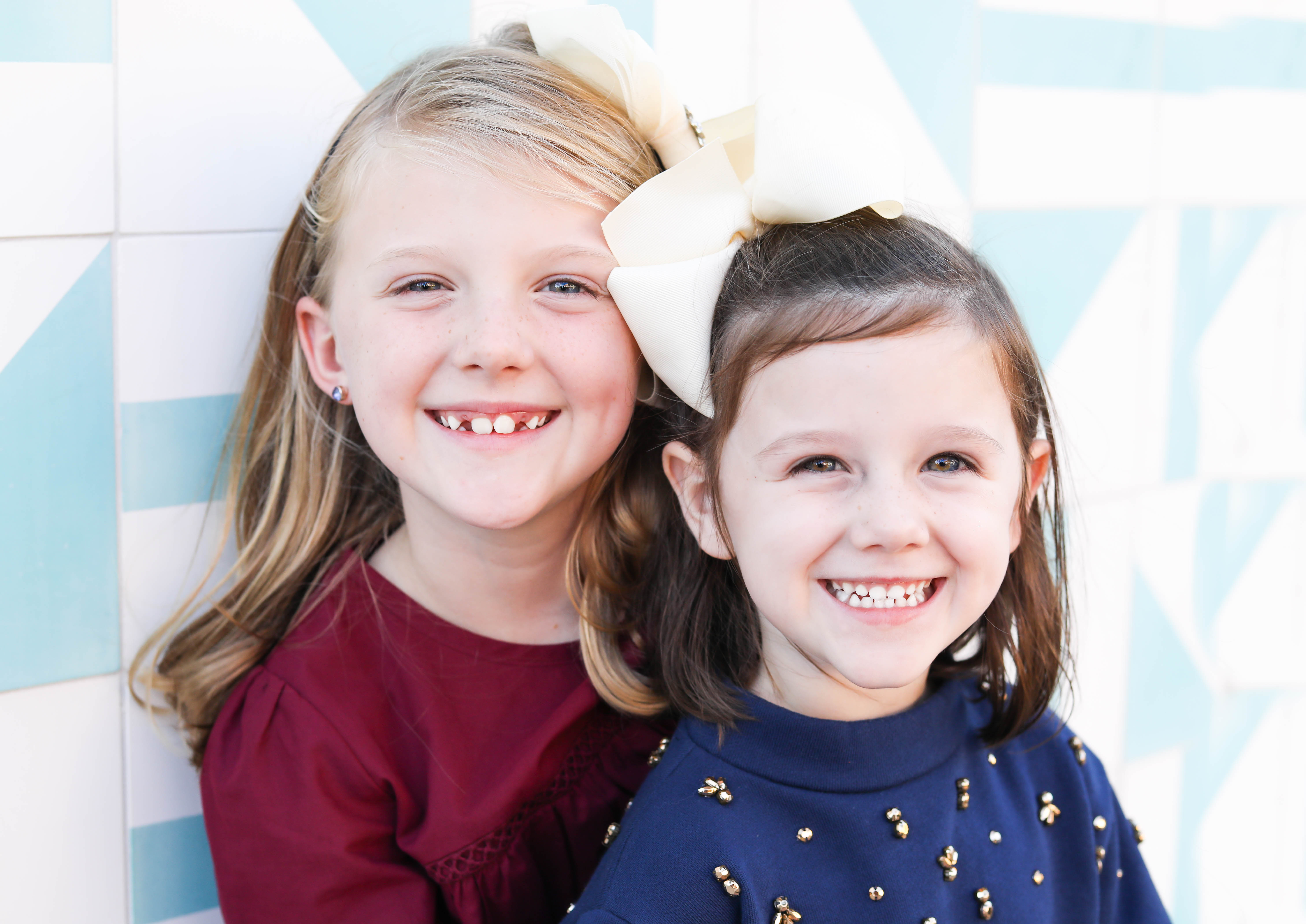 Portrait of two smiling girls, one with blonde hair and a burgundy shirt, the other with brown hair and a blue shirt.