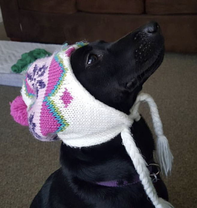 Painting of a black dog wearing a knitted hat and scarf, looking up.