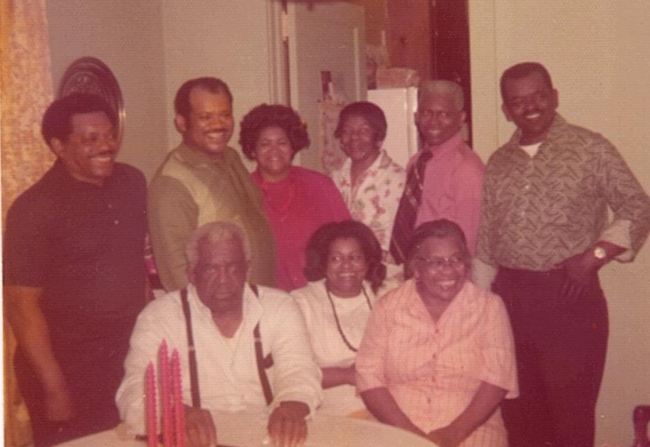 Black and white pencil sketch of a large family portrait.