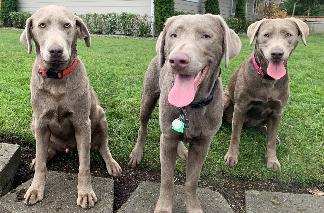 Black and white pencil sketch of three chocolate Labrador Retrievers, Duke, Cash, and Lola.