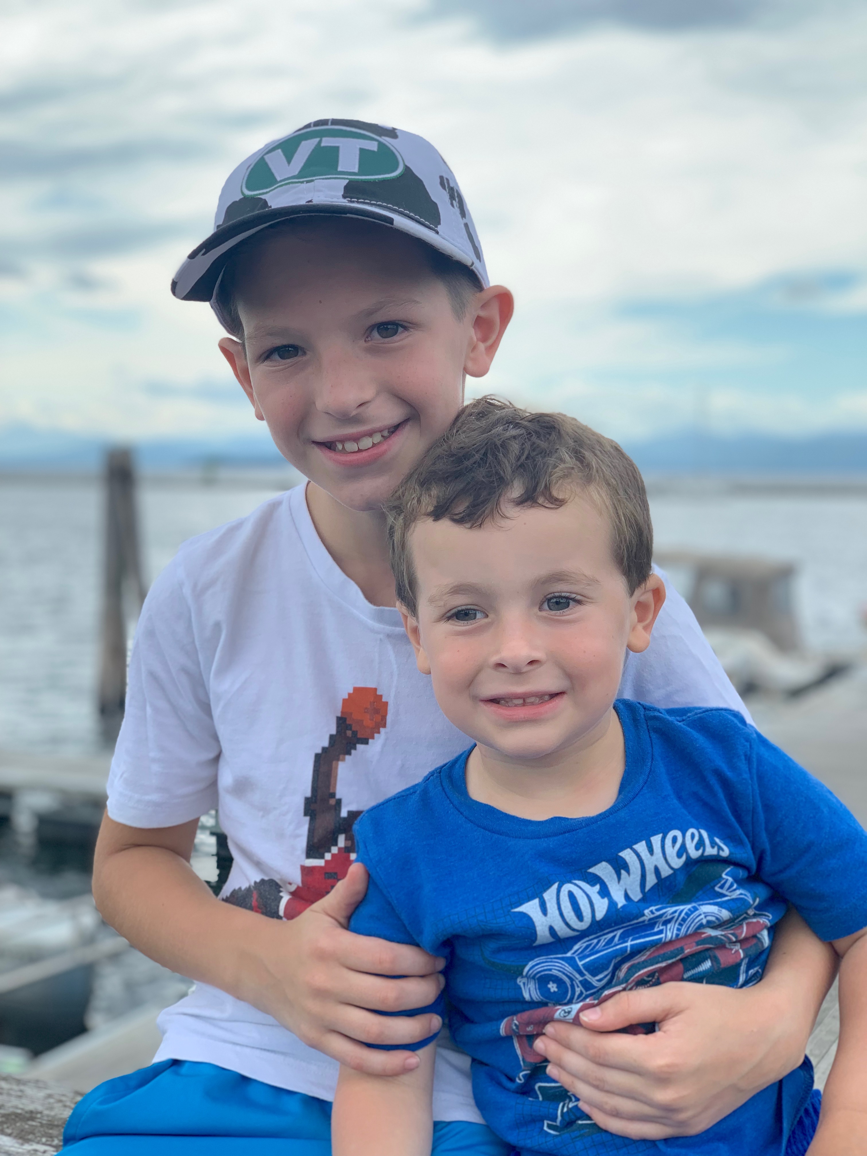Pencil sketch of two brothers, one wearing a baseball cap.