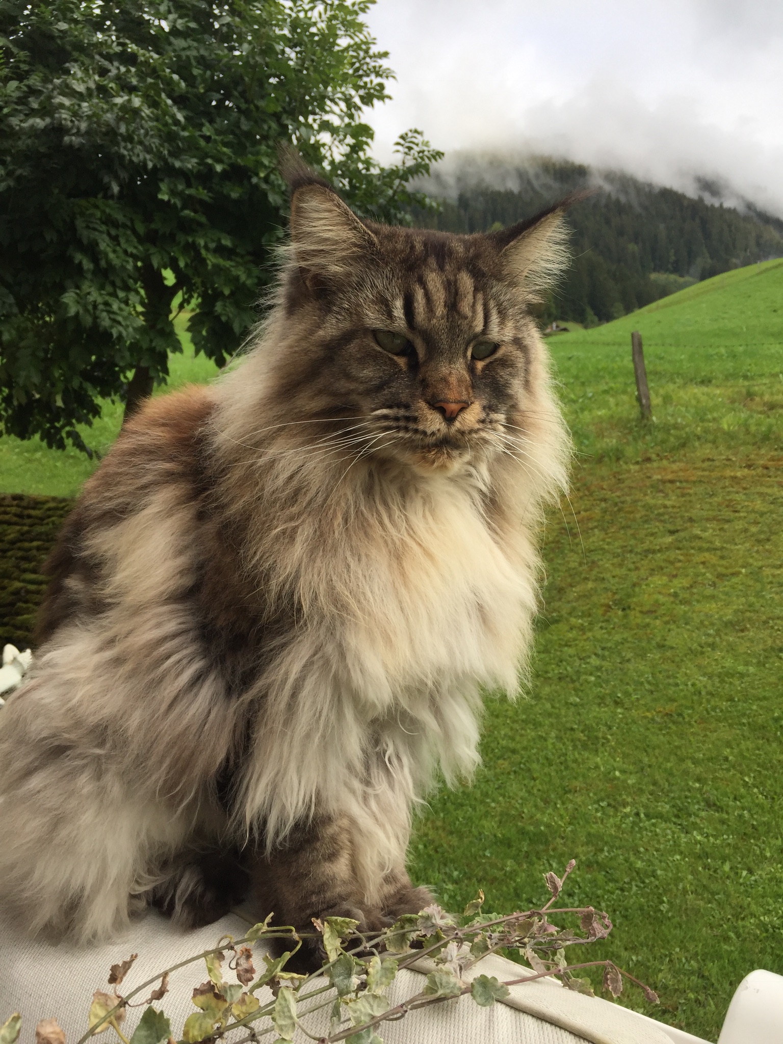 Black and white charcoal drawing of a longhaired Maine Coon cat sitting outdoors.