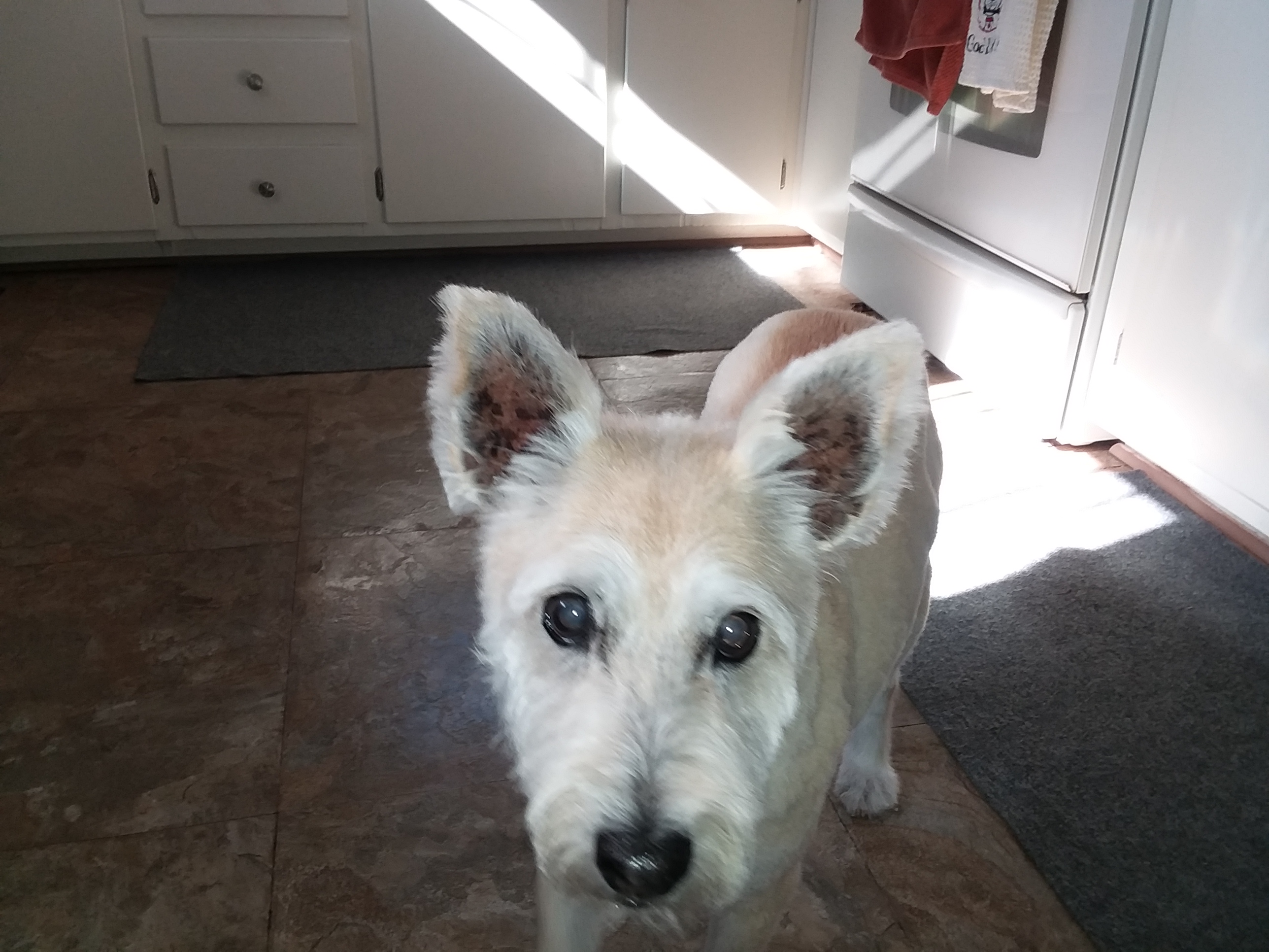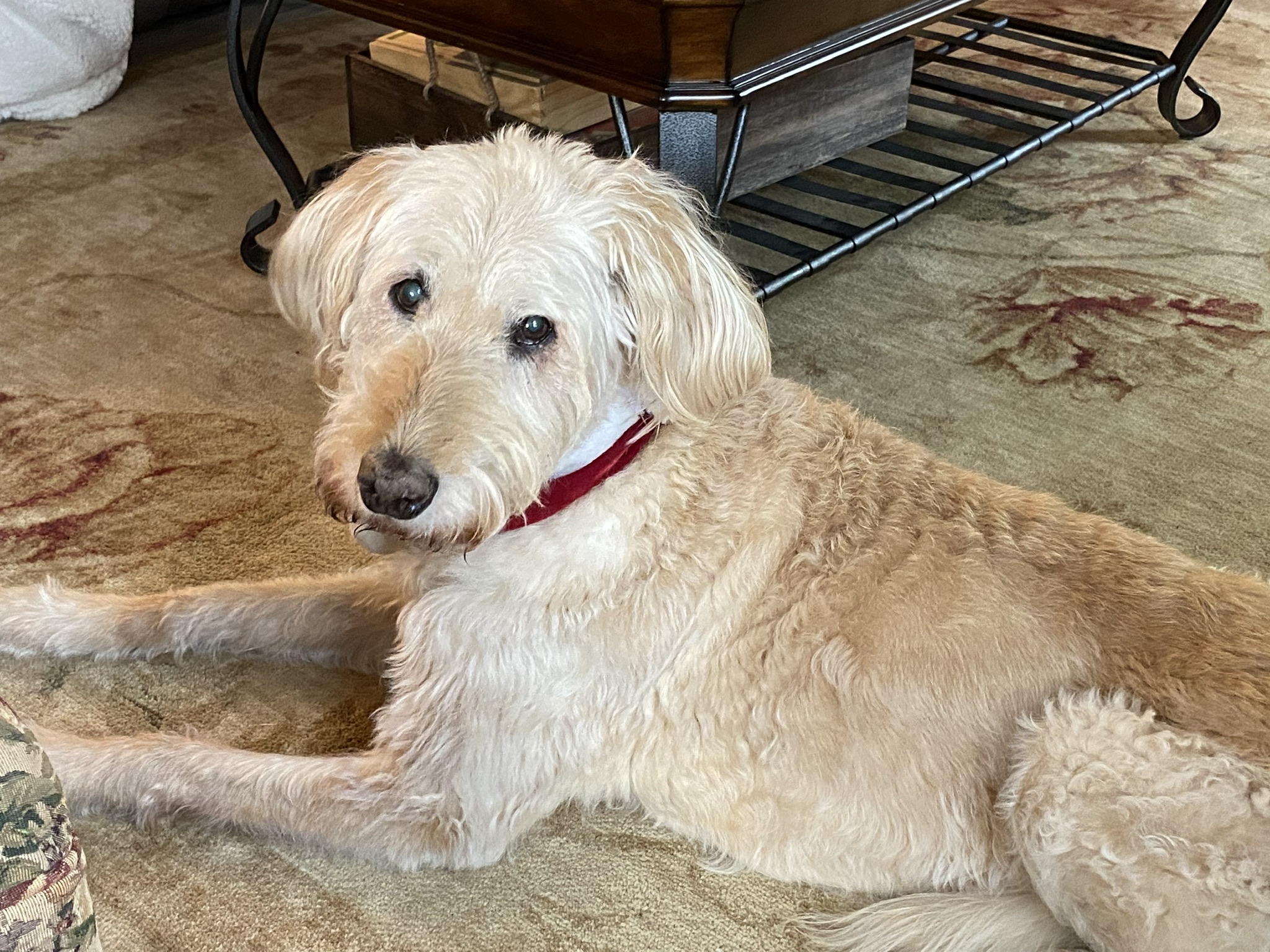 Painting of a fluffy, light-colored dog wearing a red collar.