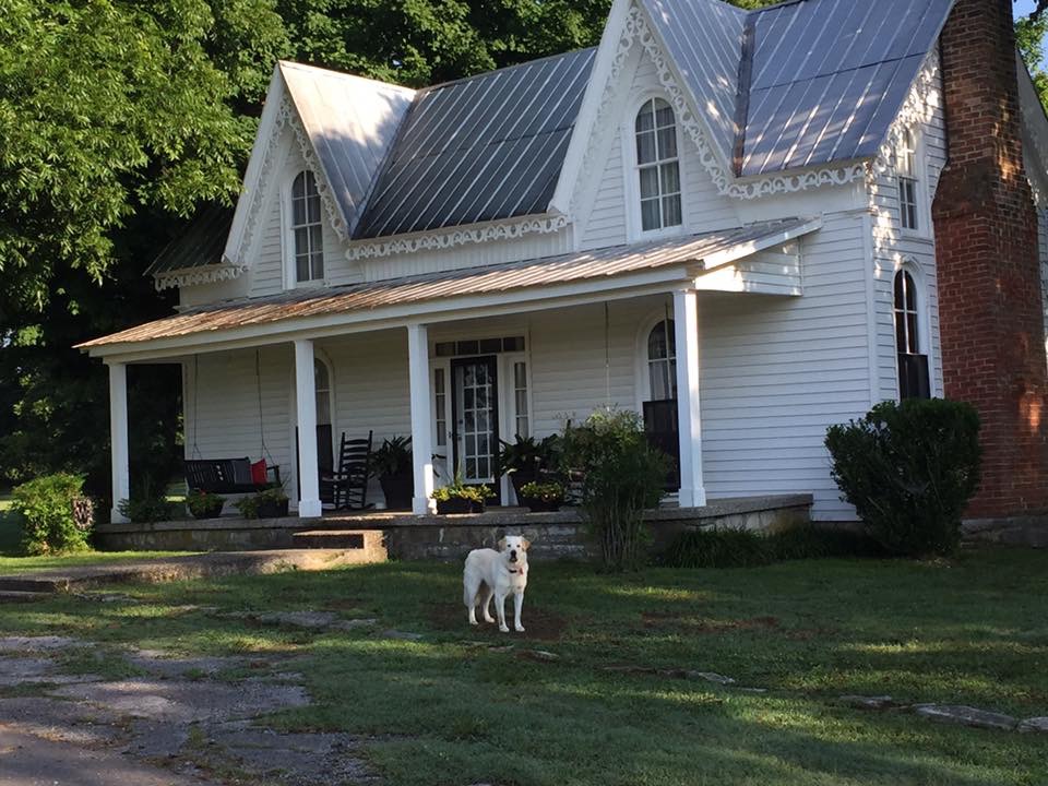 White Victorian house with a metal roof and porch, surrounded by green trees and bushes.