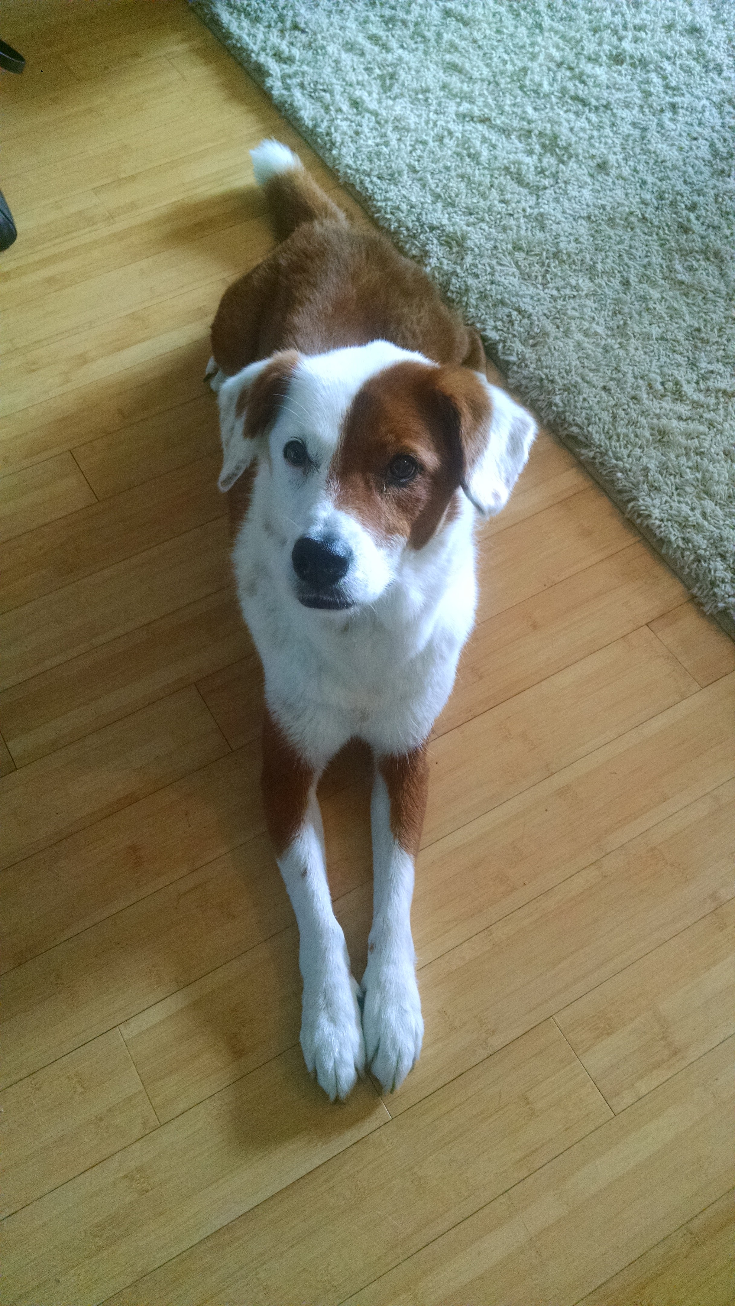 Painting of a brown and white dog wearing a collar with a tag.