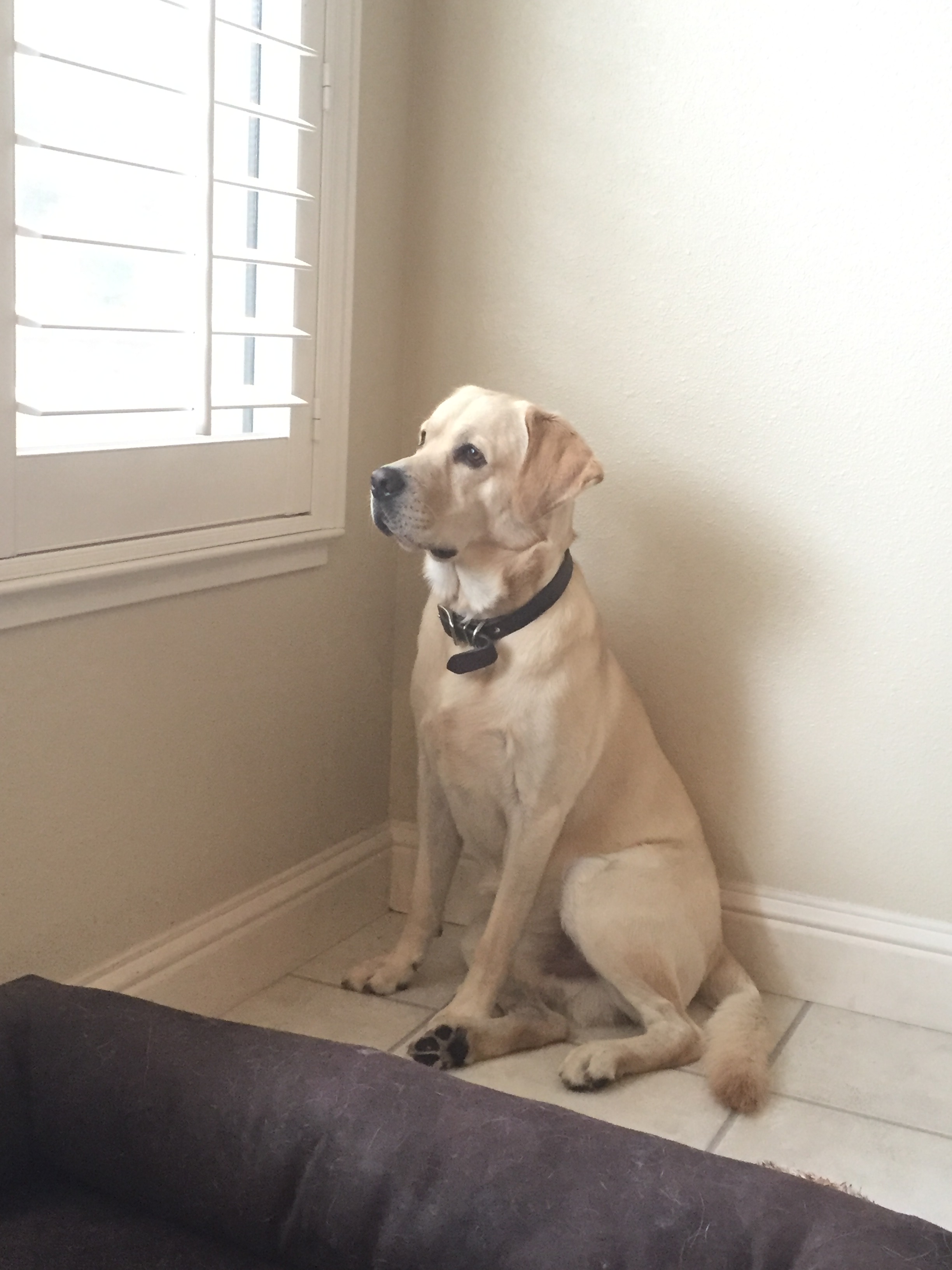Painting of a yellow Labrador Retriever sitting and looking out a window.