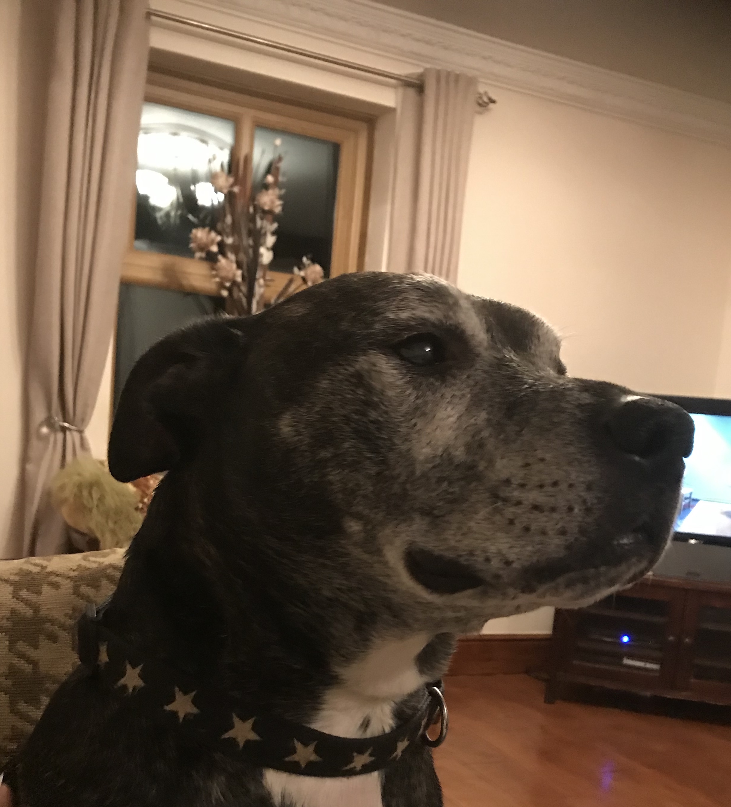 Painting of a dark-colored dog wearing a black collar with silver stars, looking upward.