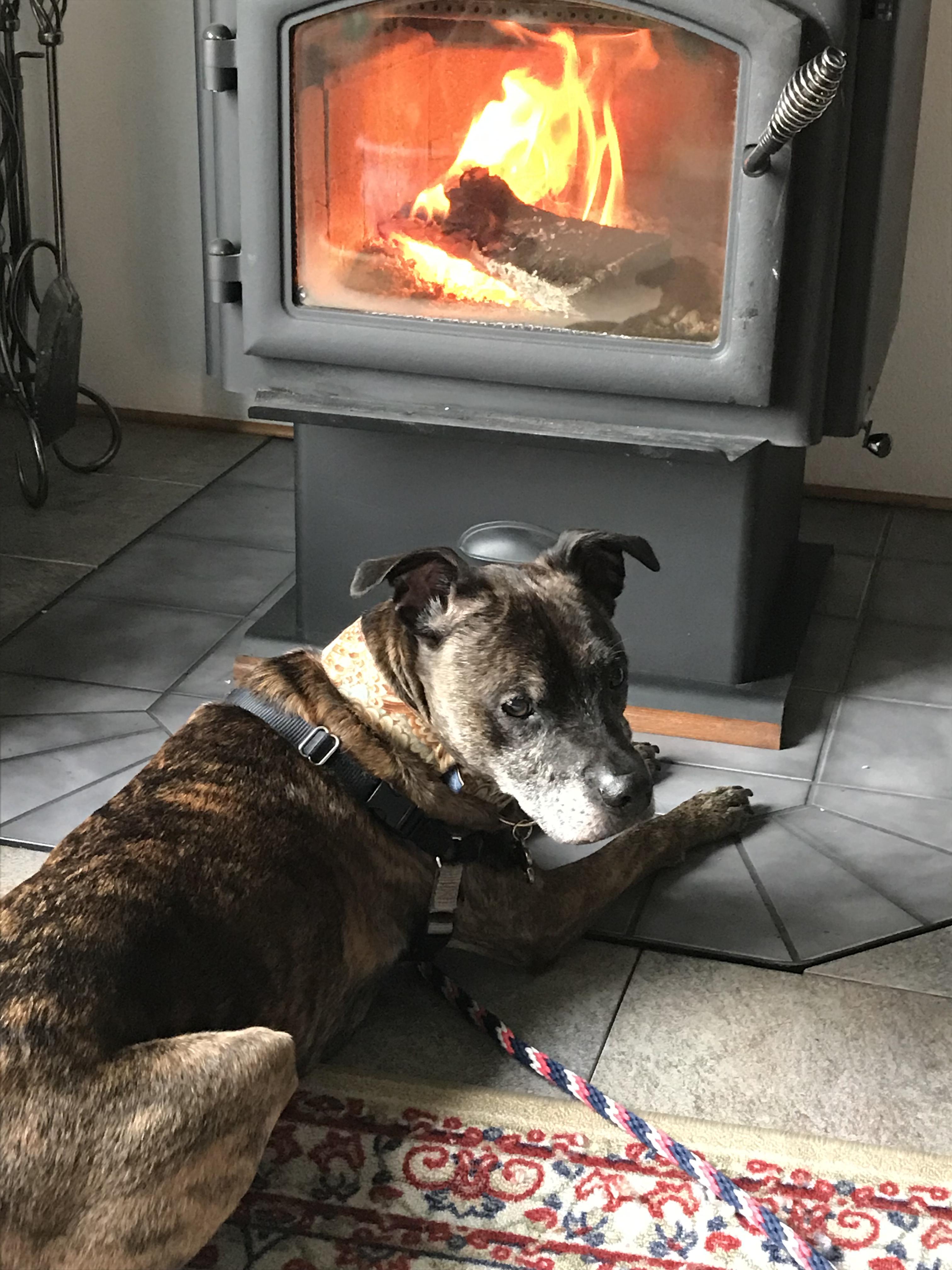 Oil painting of a brown dog lying on a red rug in front of a fireplace.