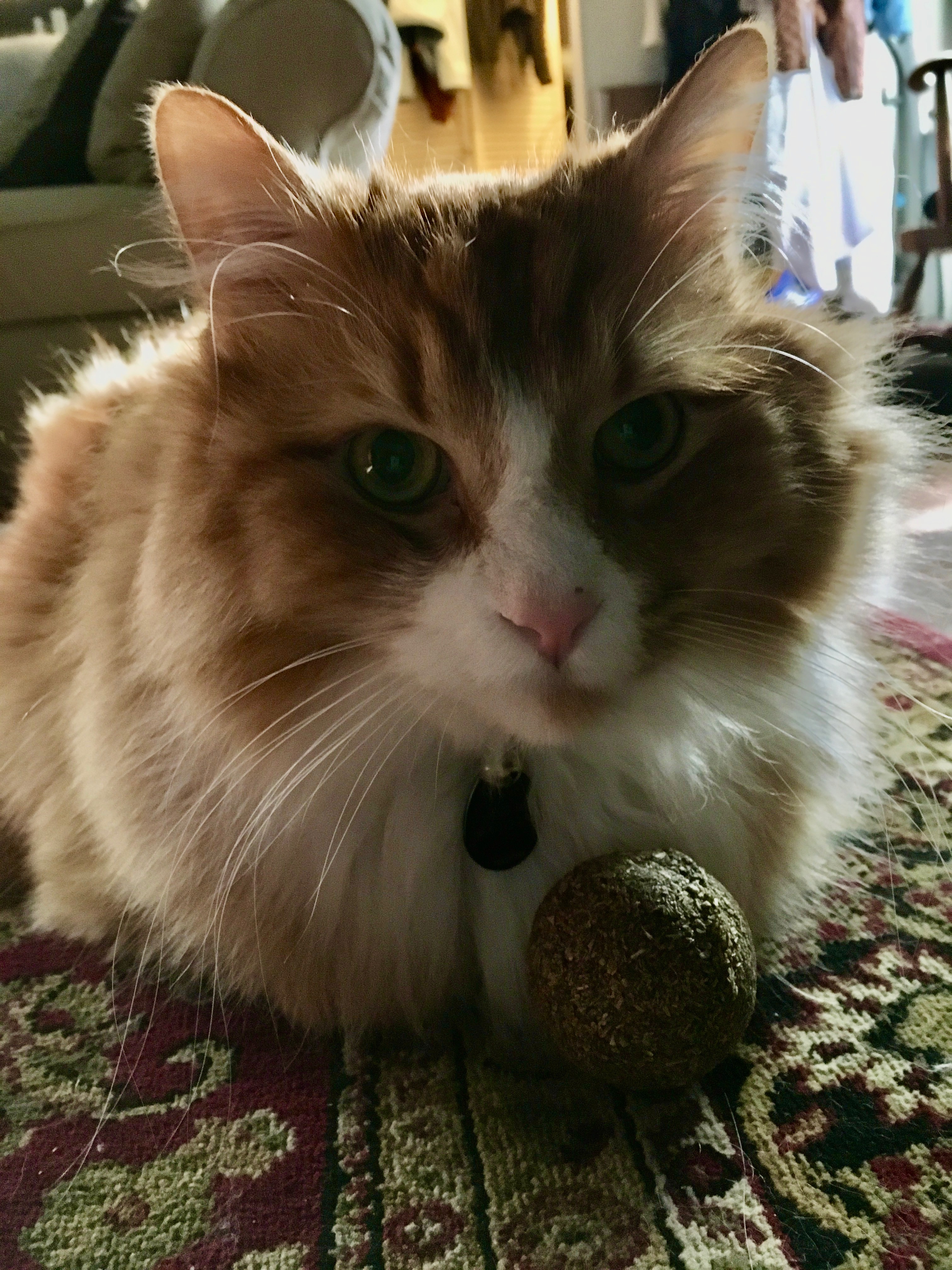 Painting of a long-haired calico cat with green eyes wearing a collar and resting on a patterned surface.