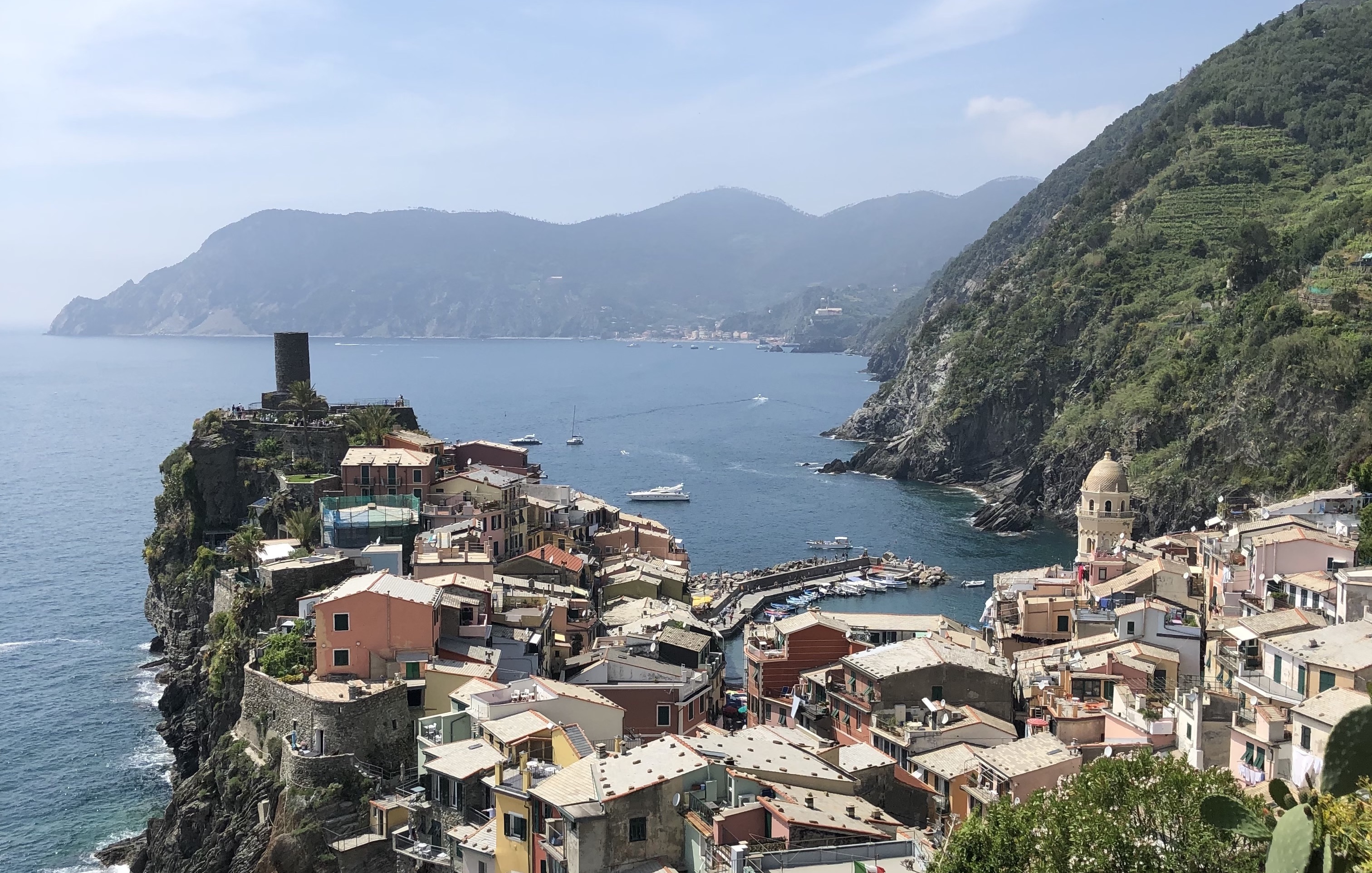 Coastal town nestled between mountains and sea, colorful buildings, boats in harbor.