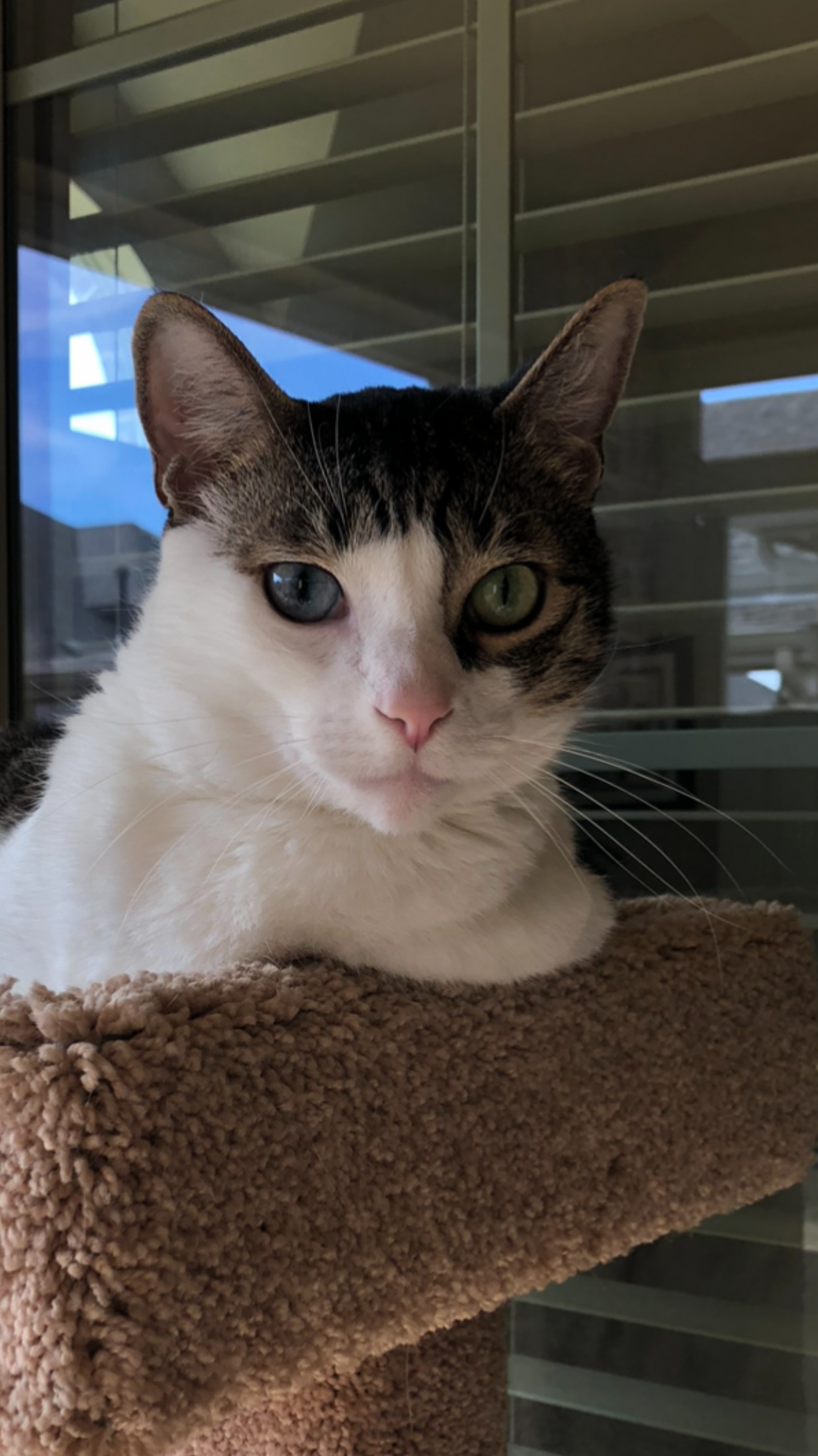 Painting of a calico cat with heterochromia iridum