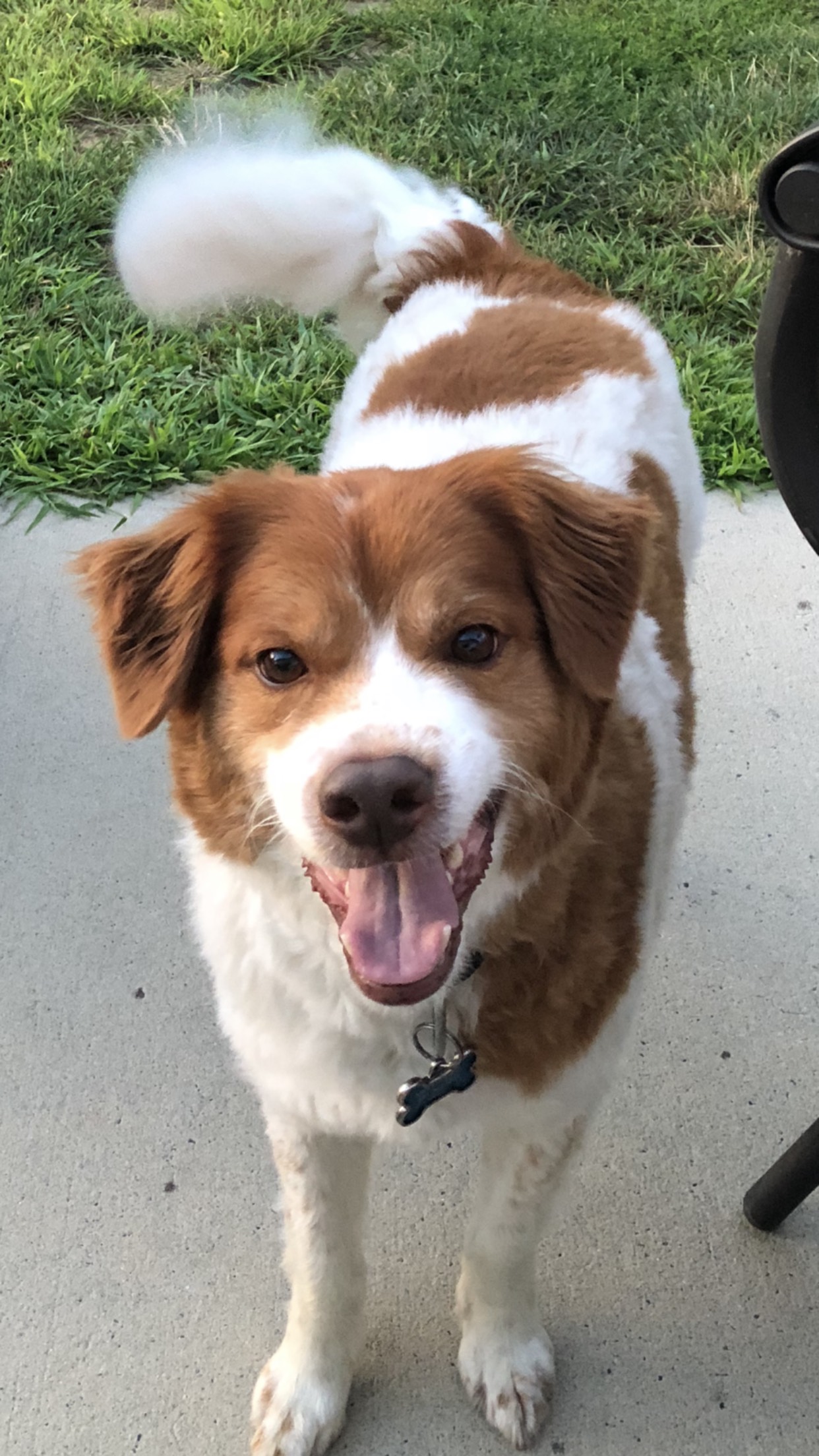 Painting of a happy brown and white dog with its tongue out, wearing a collar tag that reads Bentley