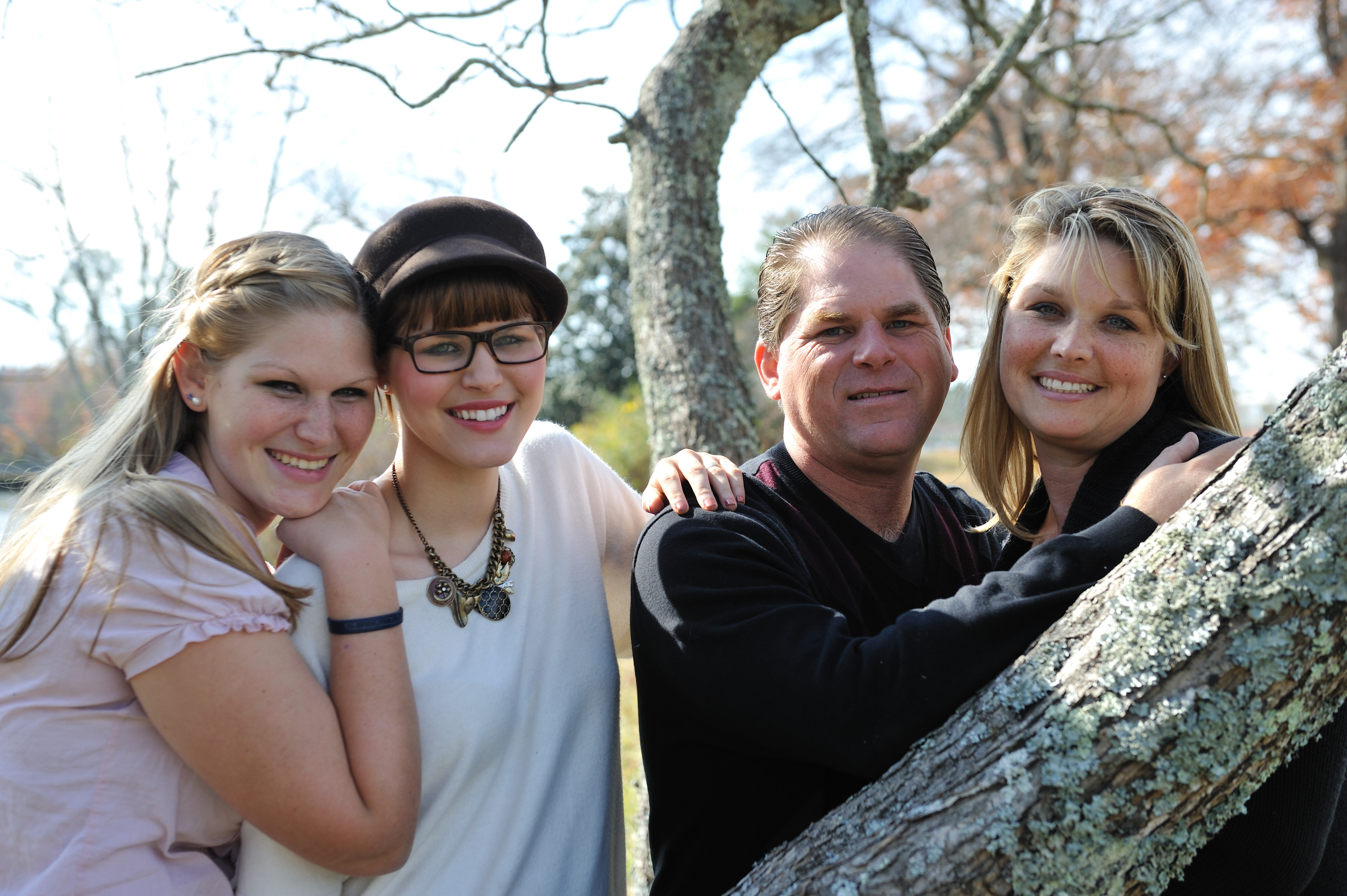 Family portrait painting, two daughters, parents, smiling, outdoors.