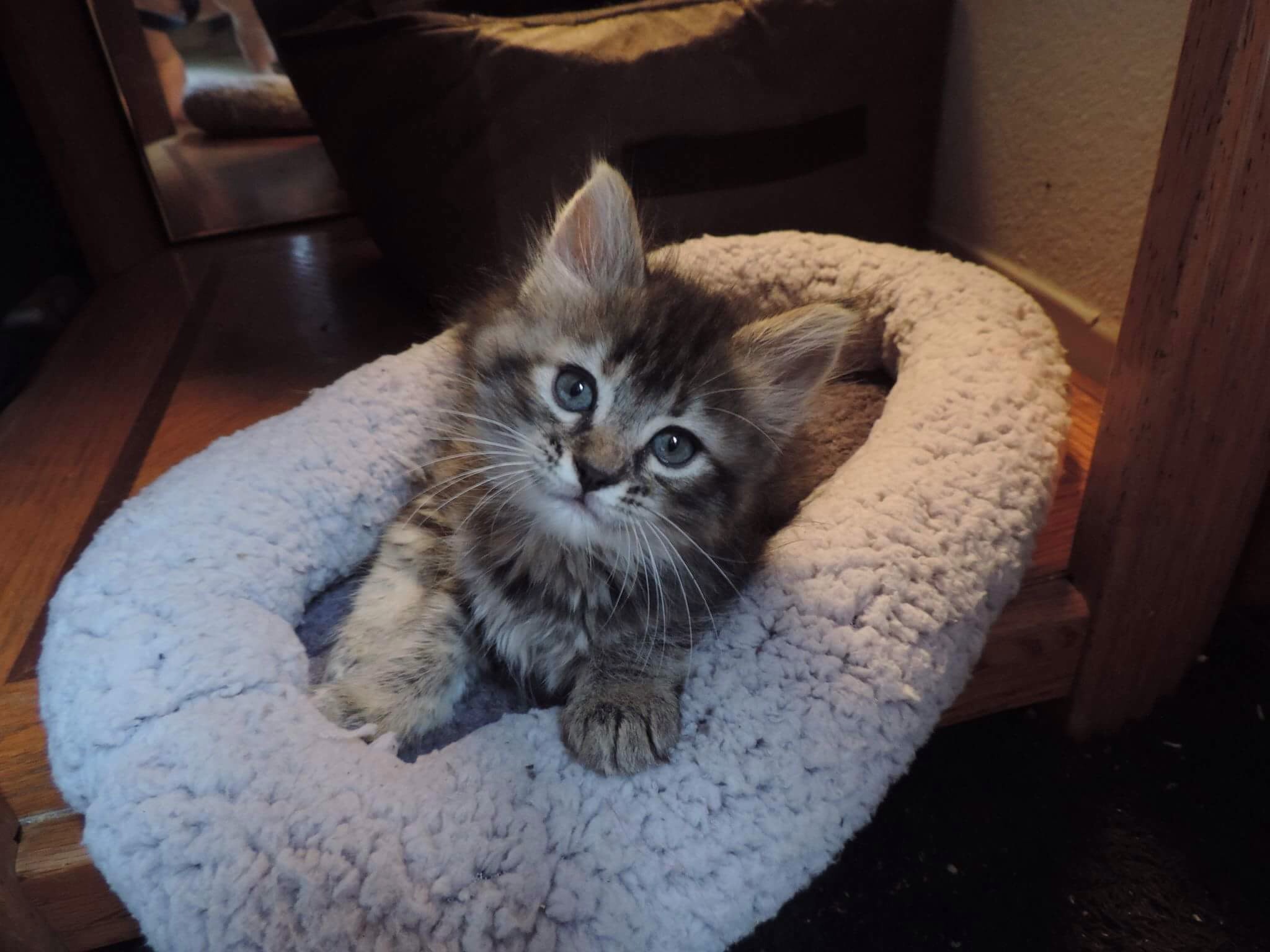 Gray tabby kitten with blue eyes in a light gray cat bed.