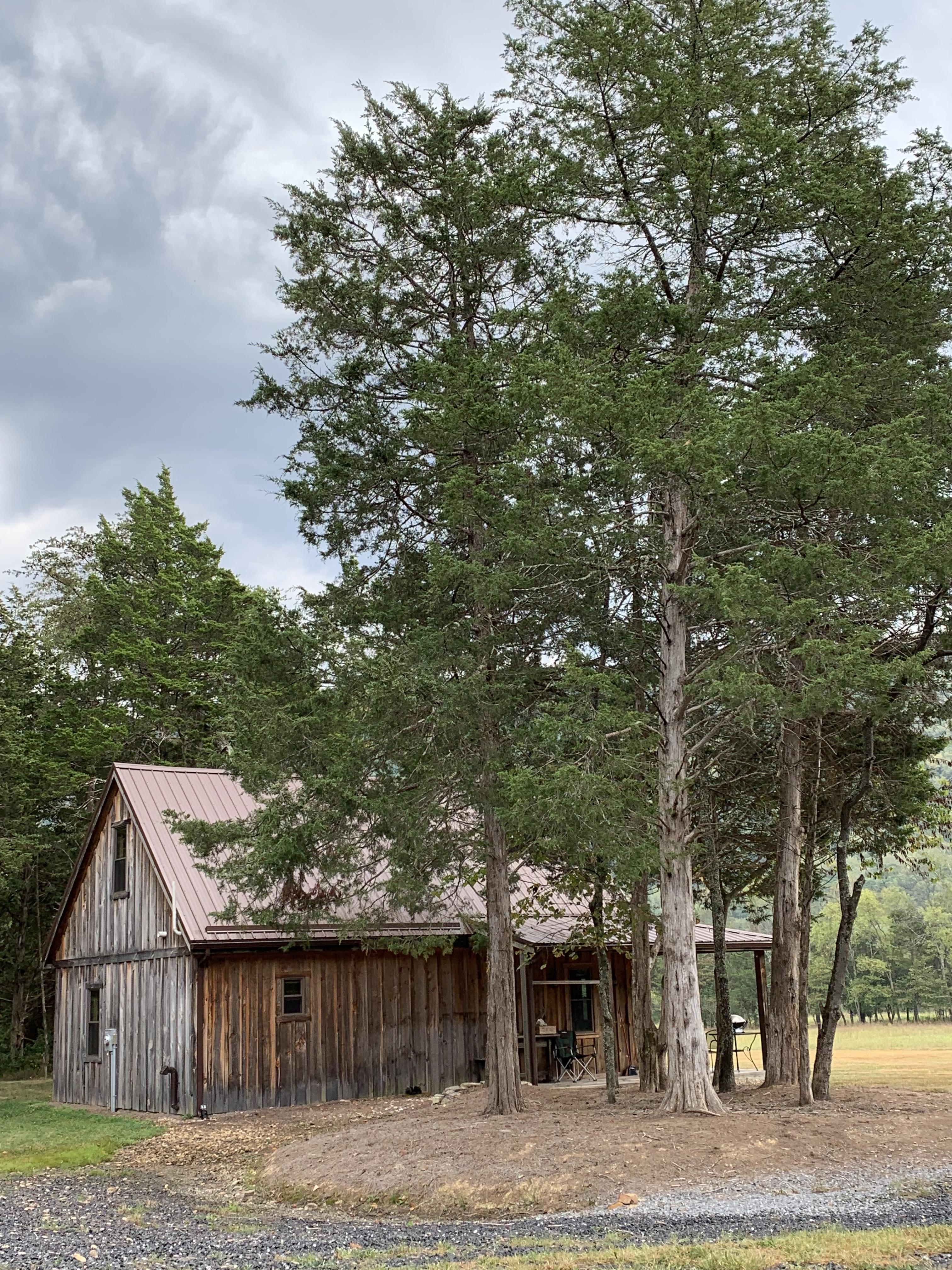 Wooden barn nestled among tall trees under a cloudy sky.