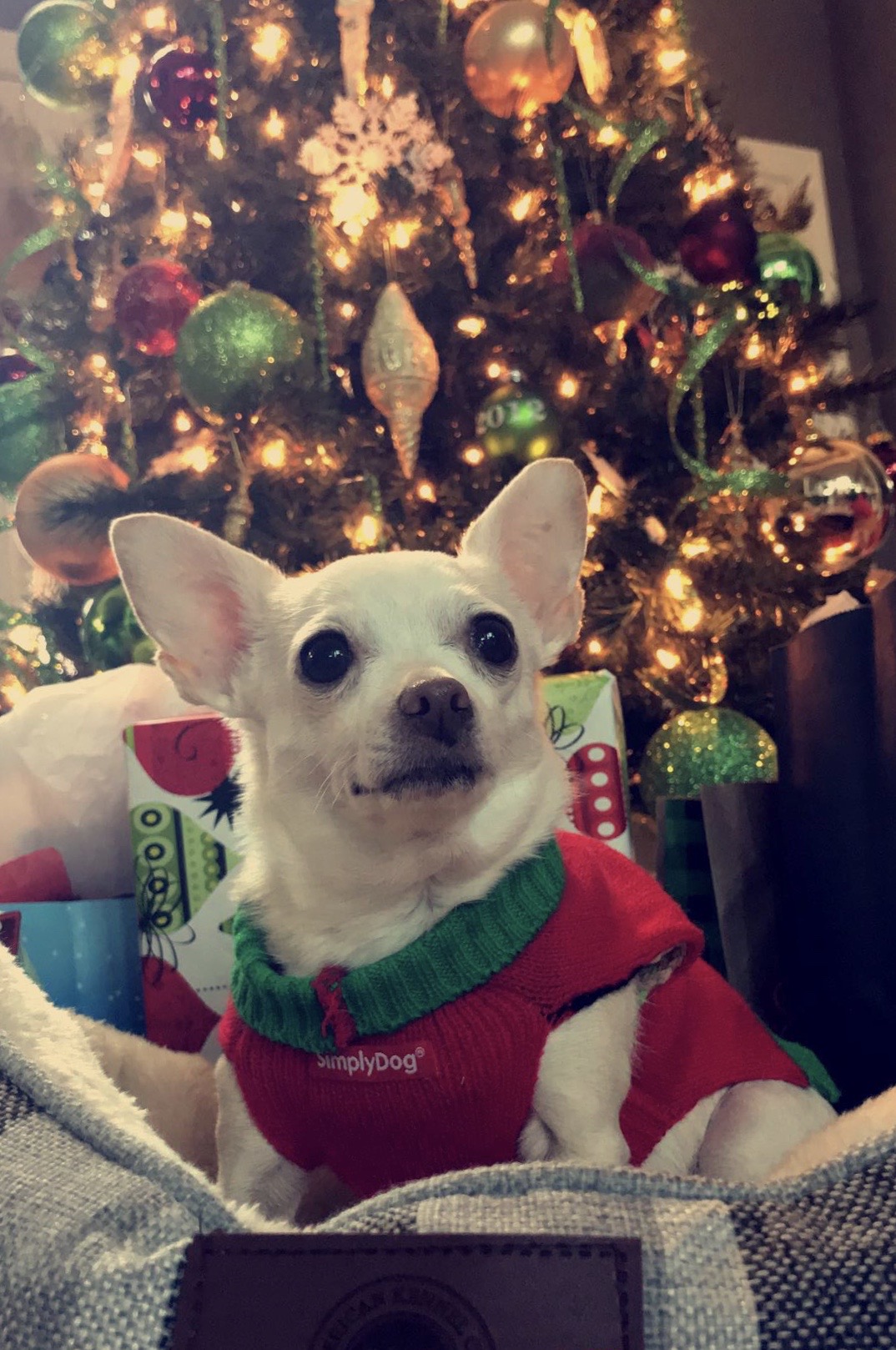 Painting of a white chihuahua wearing a red and green Christmas sweater, sitting amongst presents and Christmas decorations.