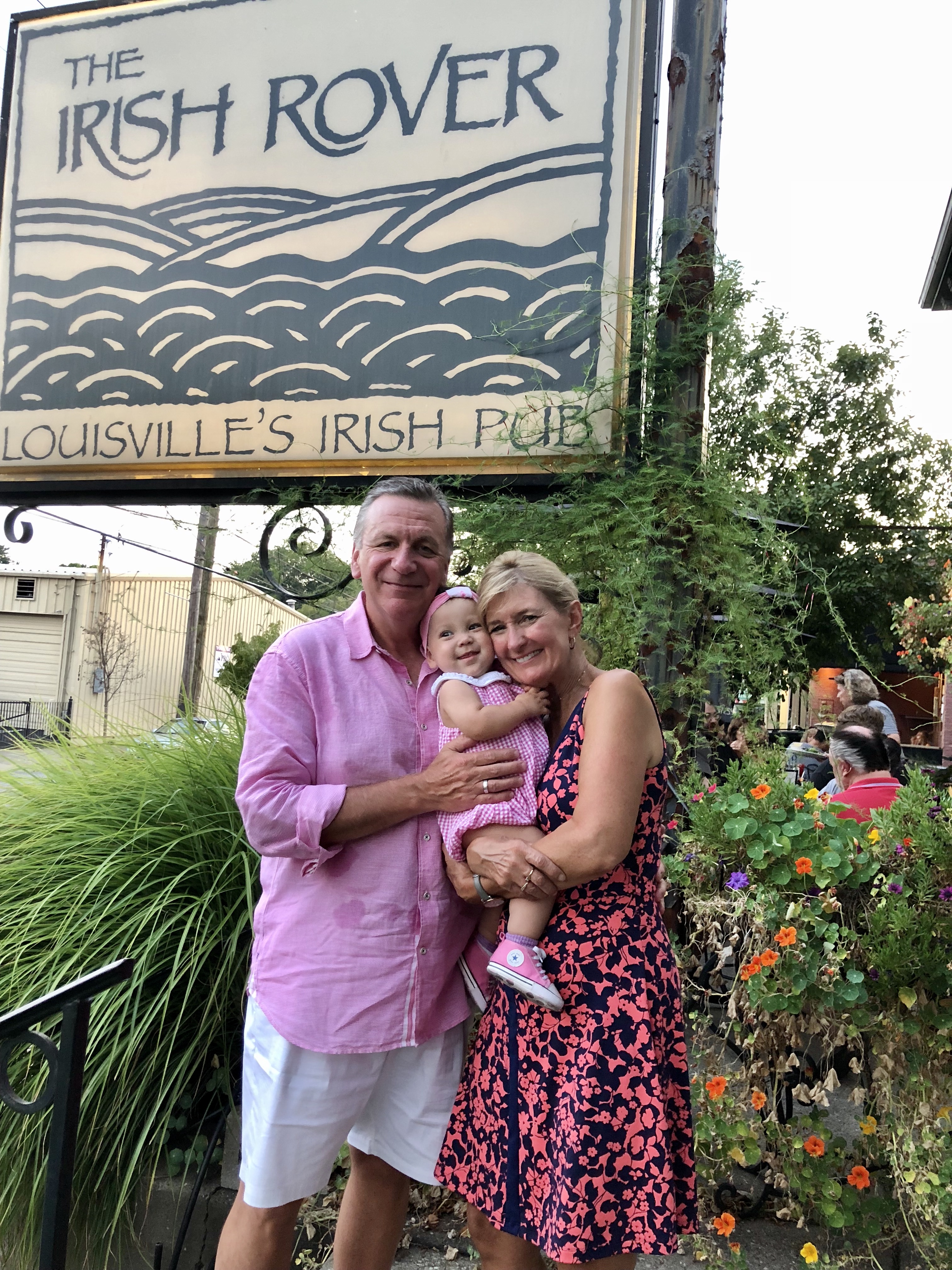 Painting of grandparents holding a baby in front of an Irish pub sign.