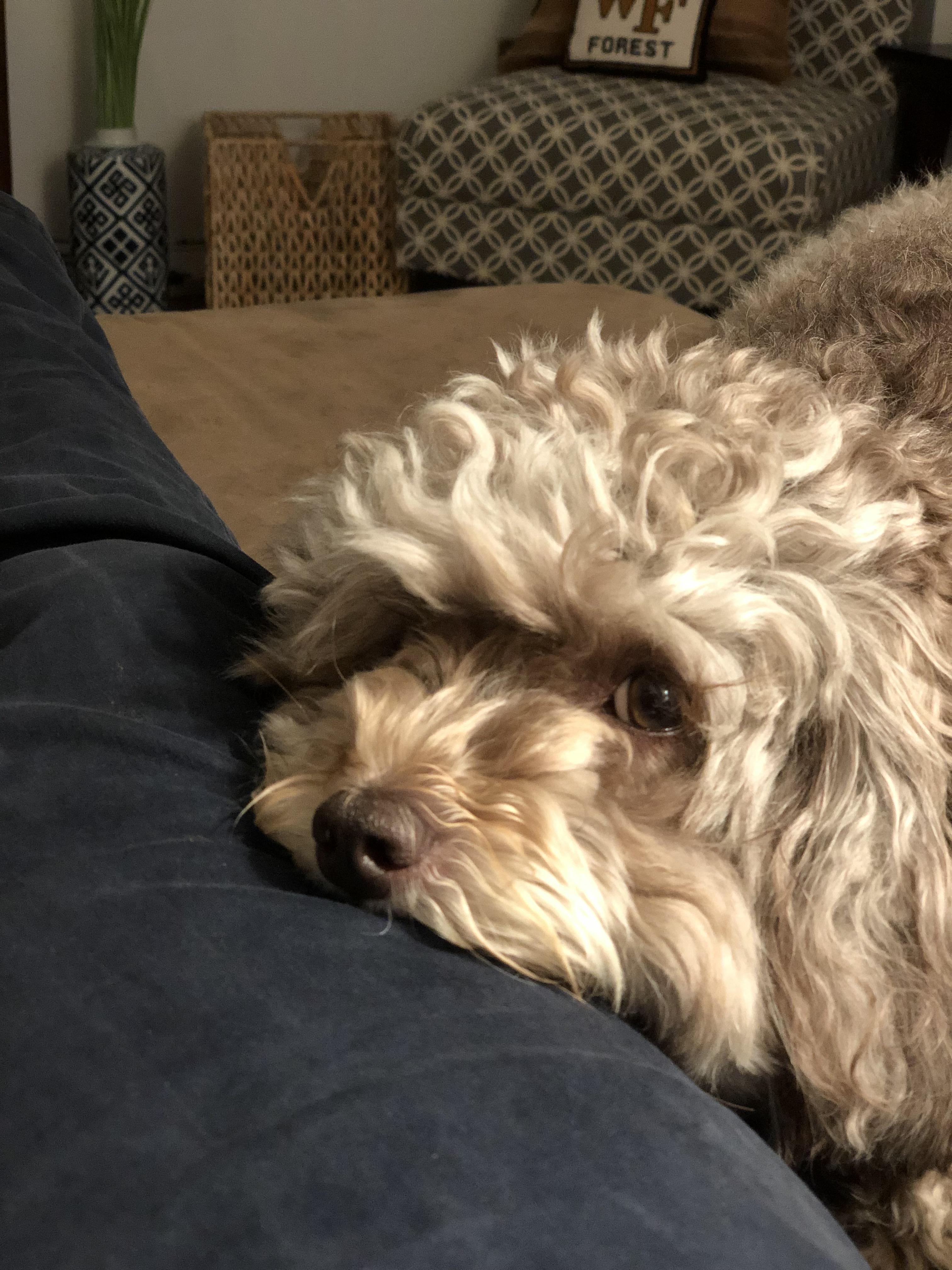Painting of a brown fluffy dog sitting on a dock wearing a teal harness.