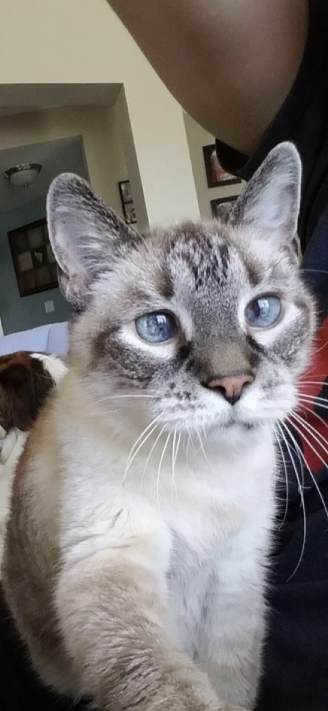 Painting of a grey and white cat with blue eyes