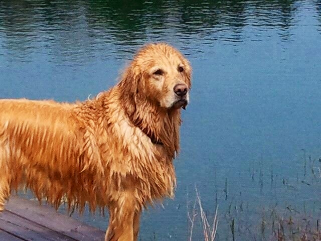 Painting of a Golden Retriever by water.