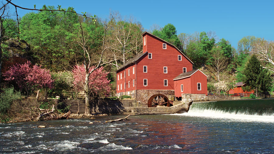 Painting of a red gristmill with a water wheel next to a river and waterfall, surrounded by lush green trees.