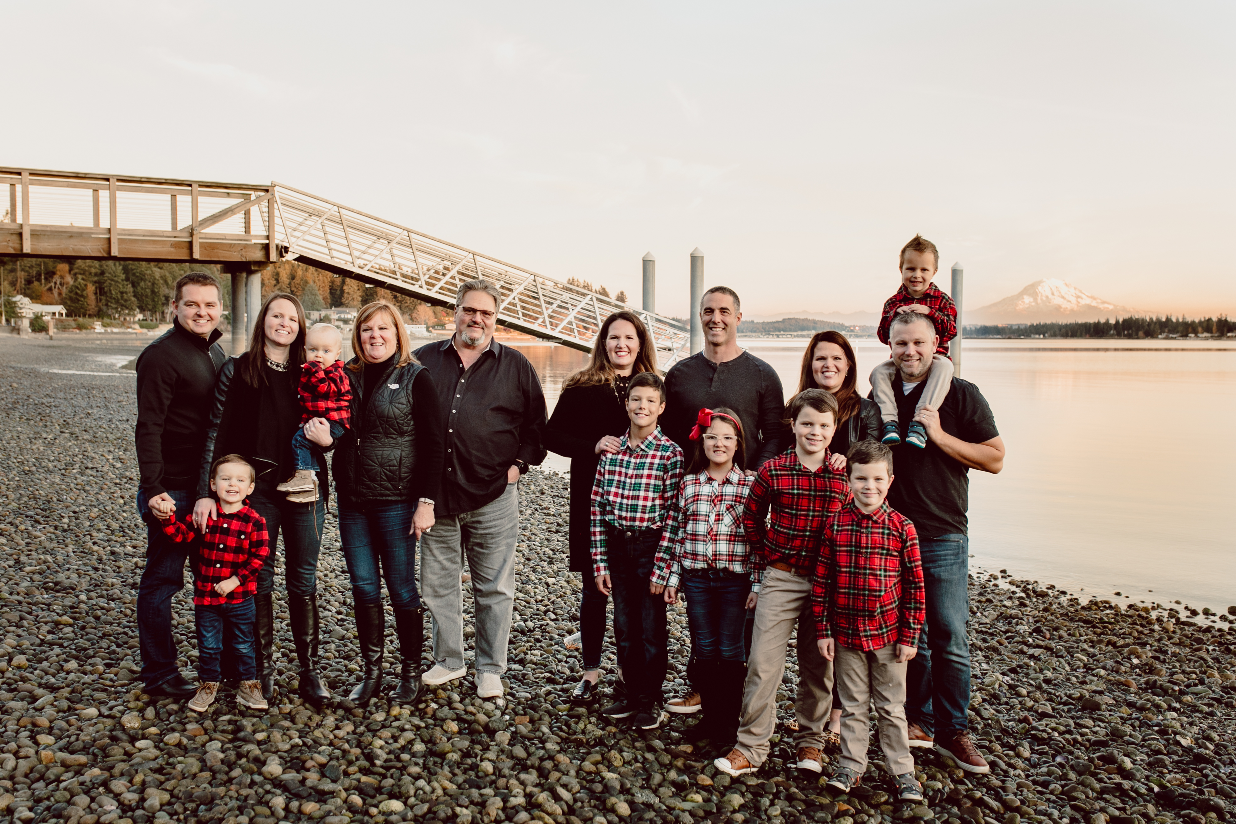 Large family portrait, outdoors by a dock.